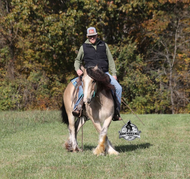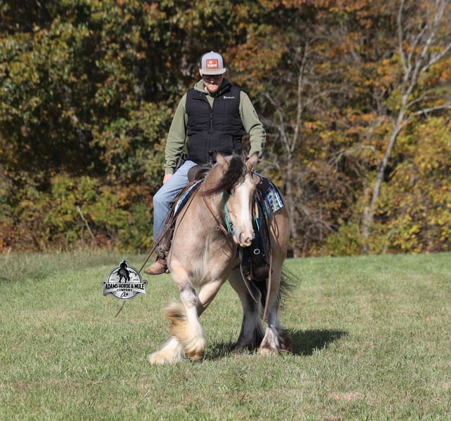 Go to visit our website for more pics and a video www.AdamsHorseAndMuleCo.com AHAMC has been in the horse business and sold horses over the internet since 2005. We have a long track record of success with hundreds of happy customers. We work hard to match riders with the correct horses and specialize in beginner safe, family friendly horses that have been used and checked out by our family! We can set up transportation anywhere in the US and look forward to working with you.This guy has the WOW factor!!! Sparklin Gold Rush aka Spark is a stout built, 2020 Model, registered Gypsy Vanner, gelding standing around 14hh and he is a rare buckskin color with lots of feathering! He is one cool looking guy! Not only does he look cool, he has all of the other boxes checked as well… he is Mr. Personality, as friendly as they come and loves attention. Spark has been in the program for the last year and has completed the natural horsemanship training and he also knows some tricks, he will lay down and set on his rump. Spark has been ridden down the highways and he is traffic safe. In addition to riding he also drives! Spark is great on trails and he will cross creeks, ditches, logs and navigate rough rocky areas. He has a smooth jog, a VERY VERY nice easy to set lope and a good stop. Spark is the best fanciest trained Gypsy that we have had and he has been in reining training. He spins circles both ways and backs with ease! He has been exposed to all kinds of wildlife such as deer or turkey or other animals like cows or dogs and will go anywhere that he is asked too. He has been ridden many miles in the mountains and encountered every obstacle possible on the trail. He will go up or down even the steepest slopes, across deep creeks, over downed trees, and over all types of rough terrain while still being sure footed. Spark is not cinchy, cold backed, does not crib or weave. Spark is a once in a lifetime type of horse that you will love for years to come!!! Feel free to call Eric 606-308-2461 with any questions.