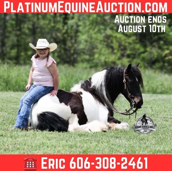 ONLINE AUCTION Place your bids at www.PlatinumEquineAuction.com Starting Bid $3500 Auction ends August 10th, 2025 Need a new saddle? Check out White Rock Saddles on our website or Facebook Meet Domino! This fancy looking Black Tobiano Gypsy Cross Gelding stands 14H and he is stocky built, he is 4 years old but its wise beyond his years! Domino has completed the natural horsemanship program and he is very friendly and loves attention!! He knows some tricks as well as he will lay down. Domino has done it all from being ridden by small children down the highways to being ridden around the ranch, pasture roped cows, rode fences and cruised the trails. Domino is confident out riding alone and does fine in groups. When out on the ranch or going down the trails he will cross creeks, ditches, logs and navigate rough, rocky areas. He is safe in traffic safe whether that be trucks or cars. He walks out easily, has a nice jog, his lope is slow and collected plus he lopes very nice circles! He has been exposed to all kinds of wildlife such as deer or turkey. He is athletic and would be a great horse to put under English tack to go over the rails with. He pastures well with others and rides the same after time off. Domino is a fun horse to ride and is sure to be everyone’s favorite! Feel free to call Eric 606-308-2461 with any questions! ONLINE AUCTION Place your bids at www.PlatinumEquineAuction.com Starting Bid $3500 Auction ends August 10th, 2025 Need a new saddle? Check out White Rock Saddles on our website or Facebook