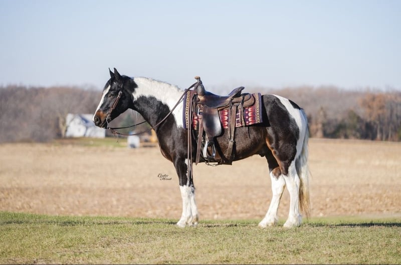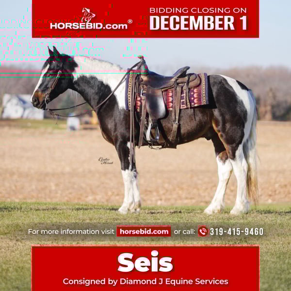 ⚜️ 𝓽𝓱𝓮 𝐇𝐨𝐫𝐬𝐞𝐦𝐚𝐧'𝐬 𝓢𝓱𝓸𝔀𝓬𝓪𝓼𝓮⚜️ Happening now thru MONDAY | DECEMBER 1st - Available EXCLUSIVELY on HorseBid's website! For more details and to register visit: www.Horsebid.com CONSIGNOR CONTACT: Diamond J Equine Services 319-415-9460 LOCATION: Fairbank IA BREED: Gypsy cross REGISTERED: No COLOR: Black and white HEIGHT: 14-2 AGE: 4 GENDER: Gelding Seis is a 4 year old Gypsy/Percheron+Morgan cross gelding. He is broke to ride and drive, single and double. He stands 14.3 hands high and is the perfect size for both adults and children. He has been ridden extensively in the arena and has lots of outside miles on the trail as well. He walks, trots, and lopes a nice circle, and is pretty to watch. He goes through the trails with ease crossing bridges, going through water, and over logs without any problems. He will ride out alone or with other horses. Seis drives just as nice as he rides! He has been driven a lot in a team, and does well by himself as well. He matches very well in a team with his 7/8ths brother, Cinco, who is also available. Please contact Jonas at 319-415-9460 with any questions! Thank you!