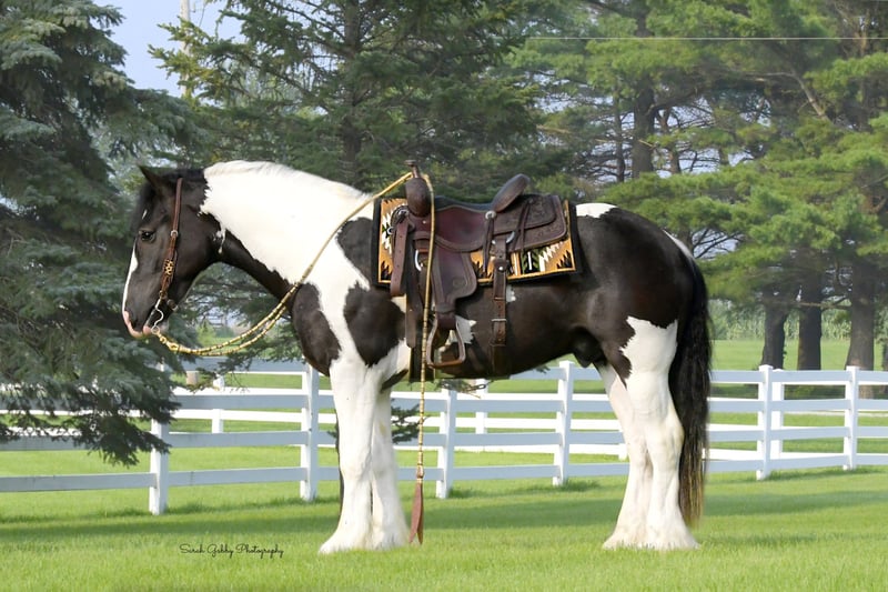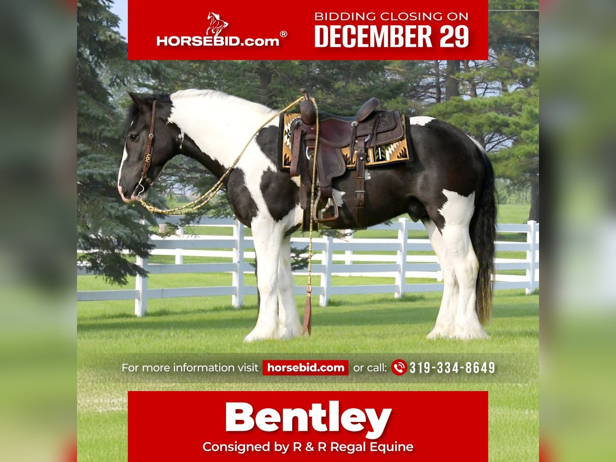 ⚜️ 𝓗𝓮𝓻𝓲𝓽𝓪𝓰𝓮 𝐖𝐢𝐧𝐭𝐞𝐫 𝓒𝓵𝓪𝓼𝓼𝓲𝓬⚜️ Happening now thru MONDAY | DECEMBER 29th - Available EXCLUSIVELY on HorseBid's website! For more details and to register visit: www.Horsebid.com CONSIGNOR CONTACT: R & R Regal Equine 319-334-8649 LOCATION: Independence IA BREED: Gypsy Vanner Haflinger Cross REGISTERED: No COLOR: Black and White Tobiano HEIGHT: 15 AGE: 4 GENDER: Gelding Bentley is a 2022 model , 15 hand Gypsy Vanner / Haflinger cross gelding with a kind, steady disposition and a willing attitude. He is trained to ride and drive and goes comfortably English and Western, making him a versatile option for a family looking for one horse that can do it all. Bentley is reliable on the trail, handling new environments calmly and confidently. He does well crossing water and takes unfamiliar situations in stride, showing a sensible, level-headed nature that families appreciate. Under saddle, he is easy to ride, responsive, and enjoys his work without being pushy. With his sturdy build, gentle temperament, and solid training foundation, Bentley is well suited for family riding, pleasure use, trail adventures, or light driving. He is a great choice for those wanting a young gelding with a good mind, versatility, and the potential to grow into a dependable long-term partner. He can be registered with GHRA