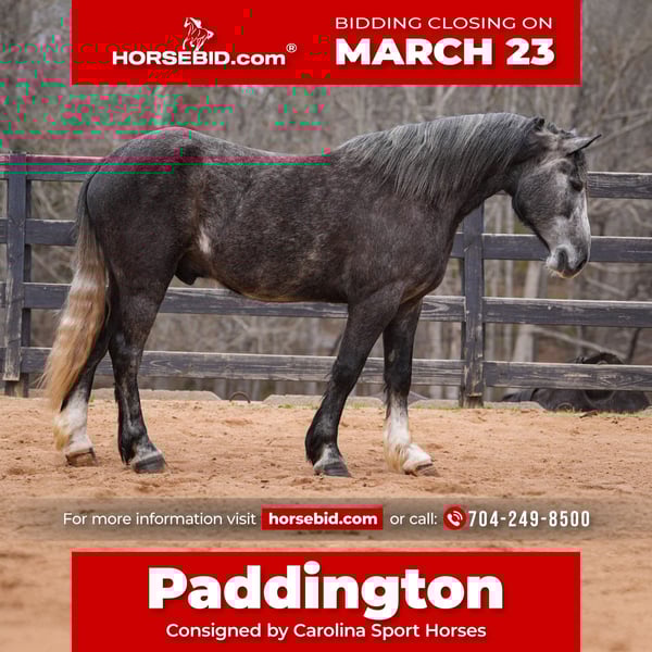 ⚜️𝓽𝓱𝓮 𝐆𝐎𝐋𝐃 𝓢𝓮𝓵𝓮𝓬𝓽⚜️ Happening now thru MONDAY | MARCH 23rd - Available EXCLUSIVELY on HorseBid's website! For more details and to register visit: www.Horsebid.com CONSIGNOR CONTACT: Carolina Sport Horses 704-249-8500 LOCATION: Clover, SC BREED: Gypsy x Quarter Horse REGISTERED: No COLOR: Gray HEIGHT: 15 AGE: 5 GENDER: Gelding 🐴 PADDINGTON – Small in Size, Big in Peace of Mind Paddington stands a handy 15 hands — a Gypsy cross with the kind of steady presence that immediately puts people at ease. And if you’re a parent… or a cautious rider… You know the real fear isn’t riding. It’s what could happen. What if he moves too fast? What if he gets nervous? What if he spooks with my child on him? What if I make the wrong choice? Paddington was built to quiet those thoughts. He is slow and deliberate. He is not quick-footed. He is not reactive. He does not rush off when mounted, and he does not look for reasons to get excited. For the youngest of riders, he offers something priceless — predictability. He stands to mount. He waits. He walks off quietly. He keeps the same steady rhythm without constant correction. And for moms who still want to enjoy riding too? Paddington is not dull or lifeless. He is safe — but still sporty enough to be fun. He has enough movement and responsiveness to keep an experienced rider smiling, without ever crossing into intimidating. He is the kind you can trust with your child… and still feel confident swinging a leg over yourself. Because let’s be honest — many parents carry a double fear: Fear for their child. And fear of buying the wrong horse. “What if he changes at our barn?” “What if he acts different off property?” “What if today isn’t like yesterday?” Paddington has proven consistency. He handles new environments with the same quiet mindset he shows at home. He does not feed off chaos. He does not escalate energy. He remains level-headed. He gives riders time. And time is what builds confidence — especially in children. For families who want safety without stiffness… Steadiness without boredom… And a horse that grows with both child and parent… Paddington offers more than just a kind personality. He offers security. And security is what allows kids to fall in love with riding — and moms to relax while they do. *All horses at CSH enjoy 24/7 turnout with a mixed herd when not in training. Training weeks they spend 3 days inside for work and 3 days off to relax. We do not feed grain but the horses to have 24/7 access to premium western alfalfa. All horses are up to date with vaccinations and worming. They are all on a 6 week farrier rotation as well and some are shod due to our rocky trails. We only train in a loose ring snaffle in western tack and a loose ring, French link or full cheek snaffle in English. Feel free to call or text me with any questions about horse care or training.* *All of our descriptions are OUR OPINION and ARE NOT FACTS. They represent how the horse responded and behaved while in our care. Horses can change at any time as they are living, breathing animals. There are no warranties expressed or implied via the descriptions above*PLEASE READ OUR BUYERS GUIDE PRIOR TO BUYING OR BIDDING ON ANY HORSE WE HAVE AVAILABLE. Interested in bringing home? Give us a call today! Please take the time to read our Buyers Guide to answer any questions or concerns you may have. Contact Us Call or TEXT 704.249.8500