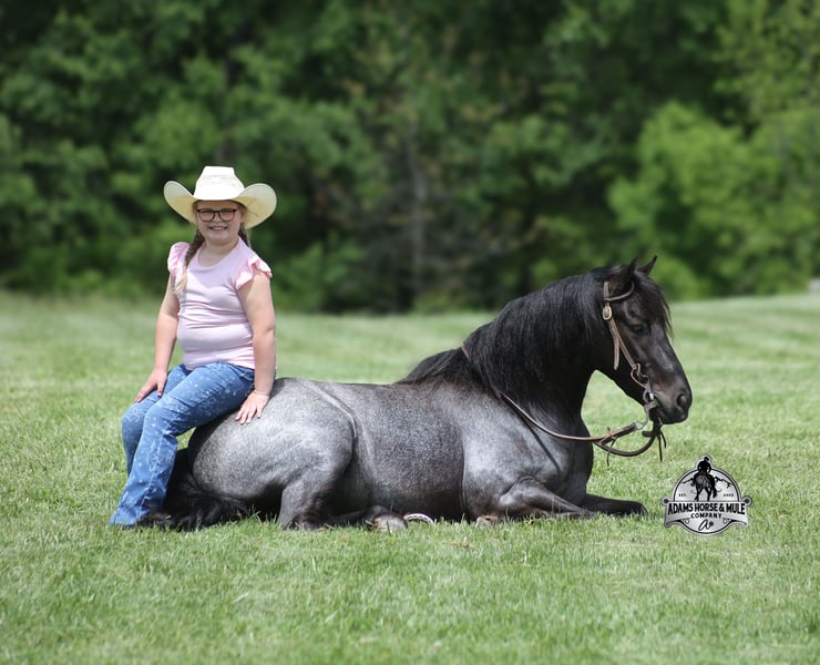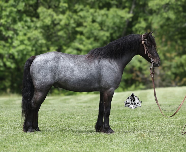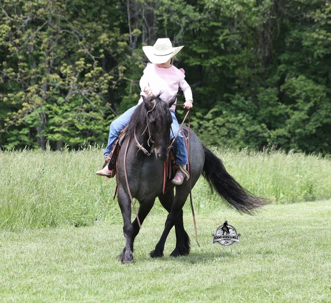 Razz is consigned to the Best Of The West Horse Sale in Gladstone, NJ on September 26-27th. You can bid online or bid in person. There is a preview day before the sale or you can come ride him prior to the sale in Mt. Vernon, KY. Razz is a 13.2h, 4 year old, Gypsy Vanner Cross, True Blue Roan Gelding and if you are looking for a horse that will bring countless smiles, miles of memories and nothing but good times in the saddle… then meet Razz. Razz has been our 7-year-old boys favorite ride all summer long, and he has been tested over and over again, passing with flying colors every time! This guy loves attention and likes to be pampered! From braids to baths, he loves his time with his kids! He is gentle enough for the kids to ride but stout enough to comfortably carry a smaller adult. Razz is a phenomenal trail horse and goes anywhere that he is asked. He has been ridden up/down steep slopes, across creeks, ditches, deadfall, rough rocky areas… you name it, and he can handle it. He rides with confidence, will go out alone, will ride in the front or back of the group and leaves the barn with no issues. Razz is traffic safe and has been ridden through town. He lopes nice circles, takes the correct leads, has a good stop and is easy to operate. In addition to riding western Razz has been ridden English and has been over jumps. He has been ridden around the ranch and through the cows. Razz is a great horse for the whole family to love and enjoy for years to come! For more info call 606-308-2461.