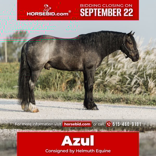 🍁𝒕𝒉𝒆 𝐅𝐀𝐋𝐋 𝑺𝒑𝒆𝒄𝒕𝒂𝒄𝒖𝒍𝒂𝒓🍁 Happening now thru MONDAY | SEPTEMBER 22nd - Available EXCLUSIVELY on HorseBid's website! For more details and to register visit: www.Horsebid.com CONSIGNOR CONTACT: Helmuth Equine 515-460-9191 LOCATION: Ames, IA BREED: Gypsy X Welsh REGISTERED: No COLOR: Blue Roan HEIGHT: 14.1 AGE: 5 GENDER: Gelding Azul is a 5 year old blue roan gelding who stands at 14.1 hh. He is a Gypsy X Welsh. Azul is very versatile and could go in any direction. He rides very well western, lopes circles on a loose rein, works nicely in an arena, and can also be collected up and ridden English, including dressage. He will safely carry anyone from a little kid to a grandma on a trail ride, and you can count on him being 100% safe. Azul also drives extremely well and is soft in the bridle. He would make an excellent pleasure driving horse or combined driving horse. He is quiet and safe enough for a complete beginner to drive, yet fancy enough to move up through the combined driving levels. He has been to town many times and is completely traffic safe. He drives both in a pair and single. He is a true sweetheart with the absolute best manners in and around the barn. Azul stands nicely to mount and to hitch up, and he walks off perfectly. He has excellent conformation with zero vices and does not require any special maintenance. If you’ve had a lifelong dream of owning a blue roan gentleman, Azul will be that and so much more!