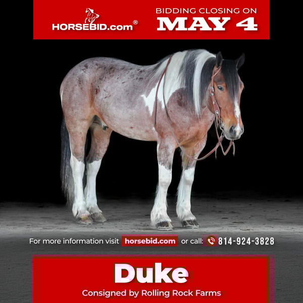 ▪️▫️◾️𝐭𝐡𝐞 𝑴𝒂𝒚 𝐒𝐞𝐥𝐞𝐜𝐭◾️▫️▪️ Happening now thru MONDAY | MAY 4th - Available EXCLUSIVELY on HorseBid's website! For more details and to register visit: www.Horsebid.com CONSIGNOR CONTACT: Rolling Rock Farms 814-924-3828 LOCATION: Miola, PA BREED: Gypsy Cross REGISTERED: Yes REGISTERED NAME: PRIDE MAKERS SMART LITTLE CAT COLOR: Red & White Paint HEIGHT: 15.1 AGE: 6 GENDER: Gelding If you’re looking for a flashy, well-built gelding with a great mind, Duke is one that gets noticed wherever he goes. Duke is a 2020 Gypsy Sport Horse gelding standing around 15 hands, with a unique bay roan tobiano coat that makes him stand out in any setting. He is an eye-catching individual with a solid, correct build, good bone, and plenty of presence. Duke has a kind, willing disposition and a level-headed attitude. He stands tied quietly, is good to handle on the ground, and has the type of personality that makes him enjoyable to be around every day. He’s the kind that wants to get along and take care of his rider. He is easy to tack up, bathe, and brush, and is friendly and dependable in all aspects of daily handling. Duke is extremely broke in the arena and will walk, trot, and lope around on a loose rein with a natural headset. He has been exposed to flags, tarps, ropes, and is used to dogs, taking everything in stride. He has the perfect combination of “go” and “whoa,” making him fun yet easy to ride. He is a very safe, steady gelding that rides quiet and honest every time. He has a solid foundation and is ready to continue in any direction. Duke is a great trail horse and has been ridden through all types of terrain, including water. He will go out alone or in a group with no issues and stays quiet and confident wherever he goes. Duke is suitable for a variety of riders, including kids, novice adults, or someone more experienced just looking to have a fun, dependable horse to enjoy. He has the kind of mind and demeanor that gives his rider confidence while still being enjoyable for someone with more experience. He does well in both a stall and turned out in pasture, making him an easy fit for a variety of setups. With his build, movement, and mind, he would make a great prospect for ranch riding, trail, or all-around work. He has the look and presence to go in the show pen, but the brain to be someone’s dependable partner at home as well. Duke is sound, sane, and ready to go on with his next partner.