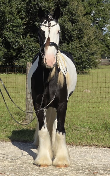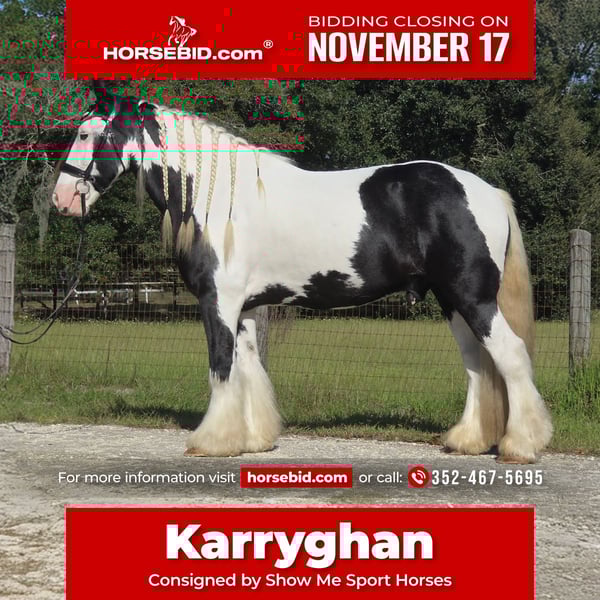 🎲𝓽𝓱𝓮 𝐑𝐈𝐃𝐄𝐑'𝐒 𝓒𝓱𝓸𝓲𝓬𝓮🎲 Happening now thru MONDAY | NOVEMBER 17th - Available EXCLUSIVELY on HorseBid's website! For more details and to register visit: www.Horsebid.com CONSIGNOR CONTACT: Show Me Sport Horses 352-467-5695 LOCATION: Ocala, FL BREED: Gypsy Vanner REGISTERED: Yes REGISTERED NAME: Sir Karryghan COLOR: Piebald HEIGHT: 15.1 AGE: 6 GENDER: Gelding Sir Karryghan 👑 Ocala, FL Offered for sale exclusively on HorseBid.com! Sir Karryghan is a stunning 6yr 15.1h Gypsy Vanner gelding registered with GVHS. He does dressage, working equitation, trail riding, trail obstacle, jumping, and cross country. He rides english and western and has one of the smoothest canters you will ever ride. Karryghan is a barn favorite! He loves attention and will greet you with a sweet knicker every day. He is a dream horse for a rider wanting a beautiful and tall Gypsy Vanner talented in many riding disciplines. Sound barefoot and up-to-date on vaccines, Coggins, floating, deworming, and hoof trimming. Please call Rachel with Show Me Sport Horses at 352-467-5695 with any questions. Shipping is available anywhere in the country.