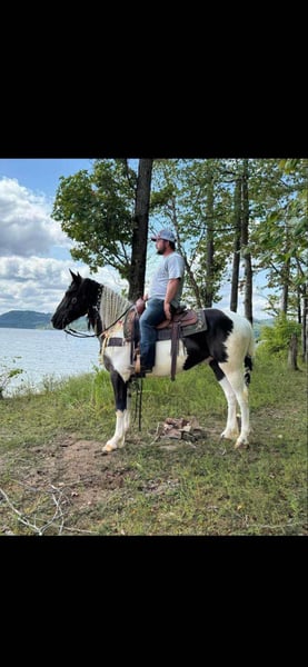 ONLINE AUCTION Place your bids at www.PlatinumEquineAuction.com Starting Bid $3500 Auction ends November 10th, 2024 Need a new saddle? Check out White Rock Saddles on our website or Facebook! Moses a handsome black-and-white paint gypsy cross gelding that is six years old and stance 15.2 hands tall we’ve had this gelding around all summer taking him on several trail rides and enjoying him every chance we can he is a laid-back and gentle horse that is easy to ride, on top of trail riding he has had six months of professional training, which includes desensitizing, laying down on command for mounting as well as dismounting side, passing backing up by using your feet, neck reining, opening and shutting gates. This is a versatile gelding that can take a full days work, whether it be on the trail or the ranch is used to being around cattle and other livestock and never causes any trouble.. nice pretty circles on the correct lead stops on low no matter command he is levelheaded on the trail and will ride for you Point him and he does not care to ride in the front, back or the middle. He talks up quietly and rides off peacefully every time. Located in Grassy Creek, KY. Contact Brandenburg Stables Zach 513-508-3684 with any questions. ONLINE AUCTION Place your bids at www.PlatinumEquineAuction.com Starting Bid $3500 Auction ends November 10th, 2024 Need a new saddle? Check out White Rock Saddles on our website or Facebook!