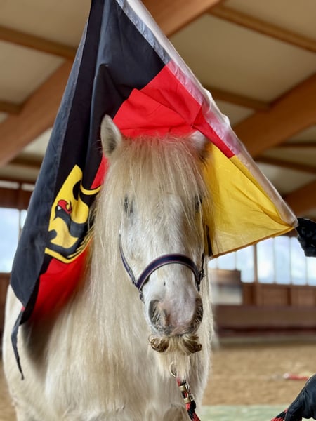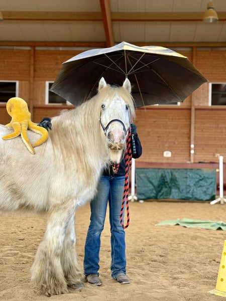 Manche Pferde wachsen einem einfach besonders ans Herz - John ist genau so einer. Geboren 2017, ca. 1,35 m groß, ein echter Irish Cob mit Charme, Charakter und ganz viel Verlässlichkeit. Wir nennen ihn liebevoll „Eisbär" , weil er mit seinem hellen Fell und ruhigen Blick einfach diese sanfte, freundliche Ausstrahlung hat. Und genau so ist er auch im Wesen: ruhig, höflich, neugierig und immer dem Menschen zugewandt. John ist im Herdenverband aufgewachsen und sozial absolut gefestigt. Im täglichen Umgang zeigt er sich vorbildlich. Er ist schmiede- und verladefromm, brav beim Putzen, Satteln und einfach angenehm in jeder Situation. Er liebt Aufmerksamkeit und genießt es, Zeit mit seinem Menschen zu verbringen. Unter dem Sattel geht er sicher in der Bahn. Er vermittelt seinem Reiter ein gutes, sicheres Gefühl und war bereits mit Kindern und Jugendlichen im Gelände unterwegs. Dort zeigt er sich als echtes Verlasspferd. Klar im Kopf, gelassen und zuverlässig. Besonders stolz sind wir auf seine Nervenstärke: Gelassenheitstraining meistert er mit einer Selbstverständlichkeit, die nicht jedes Pferd mitbringt. Die Fahne trägt er problemlos im Schritt, Trab und Galopp ruhig und konzentriert. Auch bei der Stangenarbeit ist er motiviert und aufmerksam bei der Sache. Eine aktuelle kleine AKU ohne Befund liegt selbstverständlich vor. John ist ein ehrlicher Partner fürs Leben. Für Familien, Freizeitreiter oder Kinder und Jugendliche. Ein Pferd, das Sicherheit gibt und gleichzeitig Freude macht.