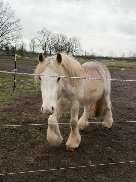 Wunderschöner und außergewöhnlicher Tinker-Hengst !! 2 Jahre alt. Er ist ein ganz braver, lieber und umgänglicher Hengst mit ganz seltener und außergewöhnlicher Farbe, die schwer zu beschreiben ist : Perlino, creme, ganz heller Isabelle und dazu mit dunklen Augen !!! Er ist auf der Wiese aufgewachsen und hat noch keine schlechten Erfahrungen gemacht. Er kennt Hufe geben und führen, mehr aber noch nicht. So ein bisschen rumspielen und geputzt werden. Er tritt nicht und beißt nicht. Sein Stockmaß wird +/- 150 cm Endmaß sein. Wer möchte sich so einen tollen Hengst selber ausbilden, der hat hier ein unverdorbenes Pferd wo alle Möglichkeiten offen stehen . Bitte nur ernstgemeine Anfragen. Keine Anfragen > was ist letzter Preis etc. Alles weitere gerne persönlich am Telefon.