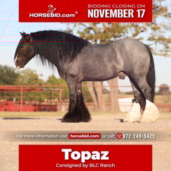 🎲𝓽𝓱𝓮 𝐑𝐈𝐃𝐄𝐑'𝐒 𝓒𝓱𝓸𝓲𝓬𝓮🎲 Happening now thru MONDAY | NOVEMBER 17th - Available EXCLUSIVELY on HorseBid's website! For more details and to register visit: www.Horsebid.com CONSIGNOR CONTACT: BLC RANCH 972-249-5425 LOCATION: Grand saline Tx BREED: Gypsy REGISTERED: Yes REGISTERED NAME: Topaz COLOR: Blue roan HEIGHT: 14.3 AGE: 6 GENDER: Stallion Meet Topaz Topaz is an exceptional Stallion that impresses and turns heads everywhere he goes. Registered GVHS (Gypsy Vanner Horse Society) AND IGEA (International Gypsy Equine Asso) Standing … with his beautiful blue roan color and matching white socks you won’t find another like him. His demeanor and personality makes him a favorite for everyone. Topaz was raised and trained by the Amish. Where he was trained in all different disciplines and drove to church every Sunday. Topaz has been there and done it all. Not only is he trained to lay down and sit on command like a dog he has had extensive saddle and driving training making him as versatile as they come. I guarantee you, you will not ride a smoother gypsy. His gate is impeccable making his ride as smooth as a rocking chair with his one foot cue right into a lope ending with a whoa stop. Topaz knows both of his leads , responds to leg cues , pivots both directions like a quarter horse and has a great stop. When we say he has been there and done it all we mean it. From carrying an extremely large flag in parades , to placing in obstacle course challenges against top quarter horses , to driving to town , going through water, carrying our children and more he has done it all and with ease. While he may not be for everyone. He has been hauled , stalled next to and ridden with mares and is always on his best behavior. He is handled by women and children daily, he is a very well mannered stallion where most would not even know he is a stud. The possibilities with Topaz are endless. Make him your number one ride and Breeder Stallion. Just like his name Northern Lights Topaz Gemstone he truly is a gem that will be a great addition for anyone. Sound and Sane - Negative for PSSM1/FIS Current on farrier , deworming , coggins and will come with health cert.