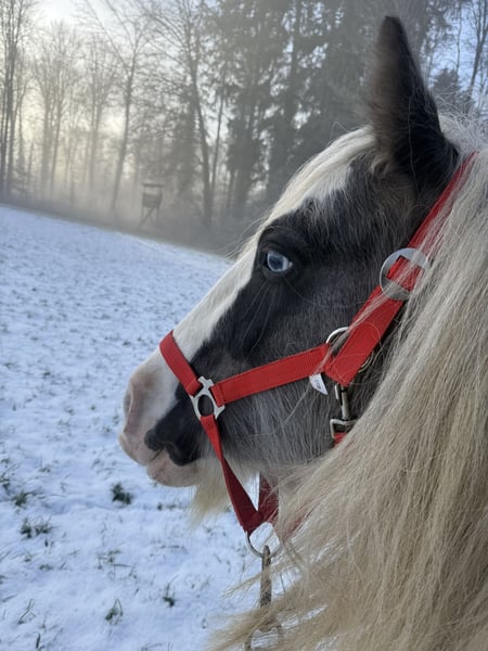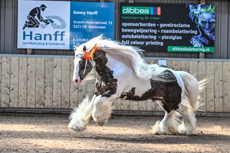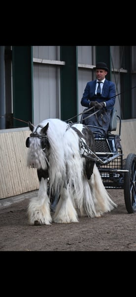 Bentley, ein außergewöhnlicher Name für einen ebenso außergewöhnlich braven Hengst. In der Traumfarbe Black Silverdapple tobiano, zeigt er im Sommer seine wunderschöne Äpfelung wo die Farbe richtig zum Ausdruck kommt. Ein kopfklarer, absolut unerschrockener Hengst mit extrem dicken, vollen Behang und einer traumhaft langen Mähne. Seinen braven neverstarken Character und üppigen Behang vererbt er an seine Fohlen weiter. 2 x vorgestellt und jeweils ausgezeichnet mit einer 1. Prämie und der Auszeichnung STER Hengst, wurde er 2022 in Holland auf der ICS geköhrt und belegte bei einer starken Internationalen Konkurrenz den 4. Platz. Er hat seine Fahrprüfung mit einer hohen Punktzahl und einer 1. Prämie und 1. Platz belegt. Bentley deckt brav an der Hand, auch bei deutlich kleineren und größeren Stuten (1,65 m). Er ist brav im Umgang und weiss sich zu benehmen, auch wenn er neben Stuten im Stall steht. Alle seine Fohlen die auf einer Körung vorgestellt wurden, erhielten eine 1. Prämie. Er steht Tinkerstuten, Fremdrassen und Mix Stuten zur Verfügung. *pssm frei *black silverdapple tobiano