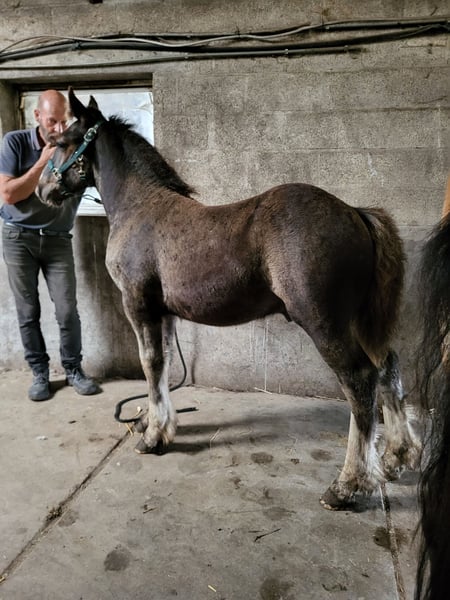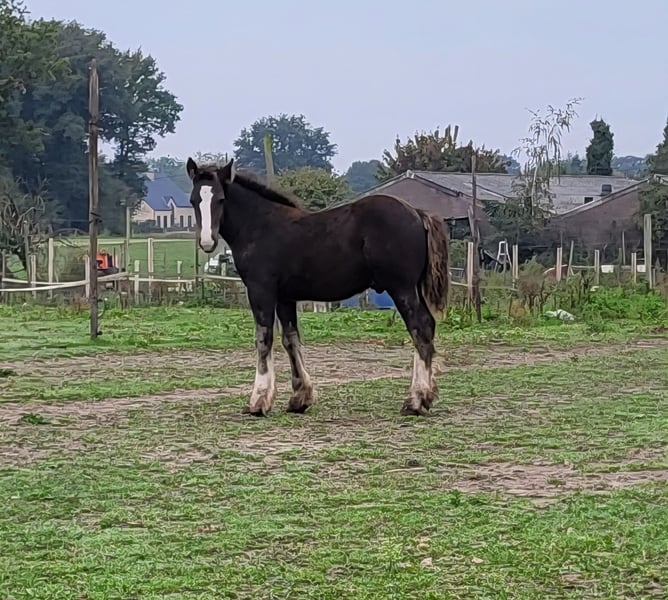 Dieser wunderschöne Kerl sucht noch ein zukünftiges 5*🏡. Carlos ist ein schwarzes Hengstfohlen mit 3 weißen Beinen. Seine Mutter ist unsere Kaltblutstute von 1,57 m (siehe vorletztes Foto), sein Vater ist unser Tinker/Irländer Hengst Meadows Booster von 1,48 m (siehe letztes Foto). Carlos ist jetzt schon ein sehr breites und großes Fohlen, er ist über 3 Monate alt und misst bereits 1,22 m. Wir erwarten, dass seine Schulterhöhe bei etwa 1,55 m liegen wird und er ein breiter, kräftiger Kerl wird. Carlos ist ein echter Freund für jedermann und sehr sozial. Er kommt immer zu dir auf die Weide, liebt jegliche Aufmerksamkeit und ist einfach ein unglaublich entspanntes Fohlen. Er hat fast vor nichts Angst und geht gerne auf Entdeckungstour. So steht er entspannt an der Traktor, wenn wir damit auf die Weide fahren, hat keine Angst vor flatterndem Plastik und man kann die verrücktesten Dinge mit ihm machen. Carlos ist pssm1-frei gezüchtet und wächst in Herdenverband auf. Wenn er umzieht, kennt er sein Fohlen-ABC. Das bedeutet, dass er das Anbinden kennt, am Seil mitläuft, stehen bleibt, geputzt wird, mit Spray vertraut ist und man ihm die Hufe auskratzen kann. Er besitzt zudem einen Pass + Chip, wird regelmäßig entwurmt, beschlagen und hat seine erste Impfung erhalten. Carlos steht in Oud-Sint-Jansberg, Belgisch Limburg. Schreibt gerne eine PN für weitere Informationen.