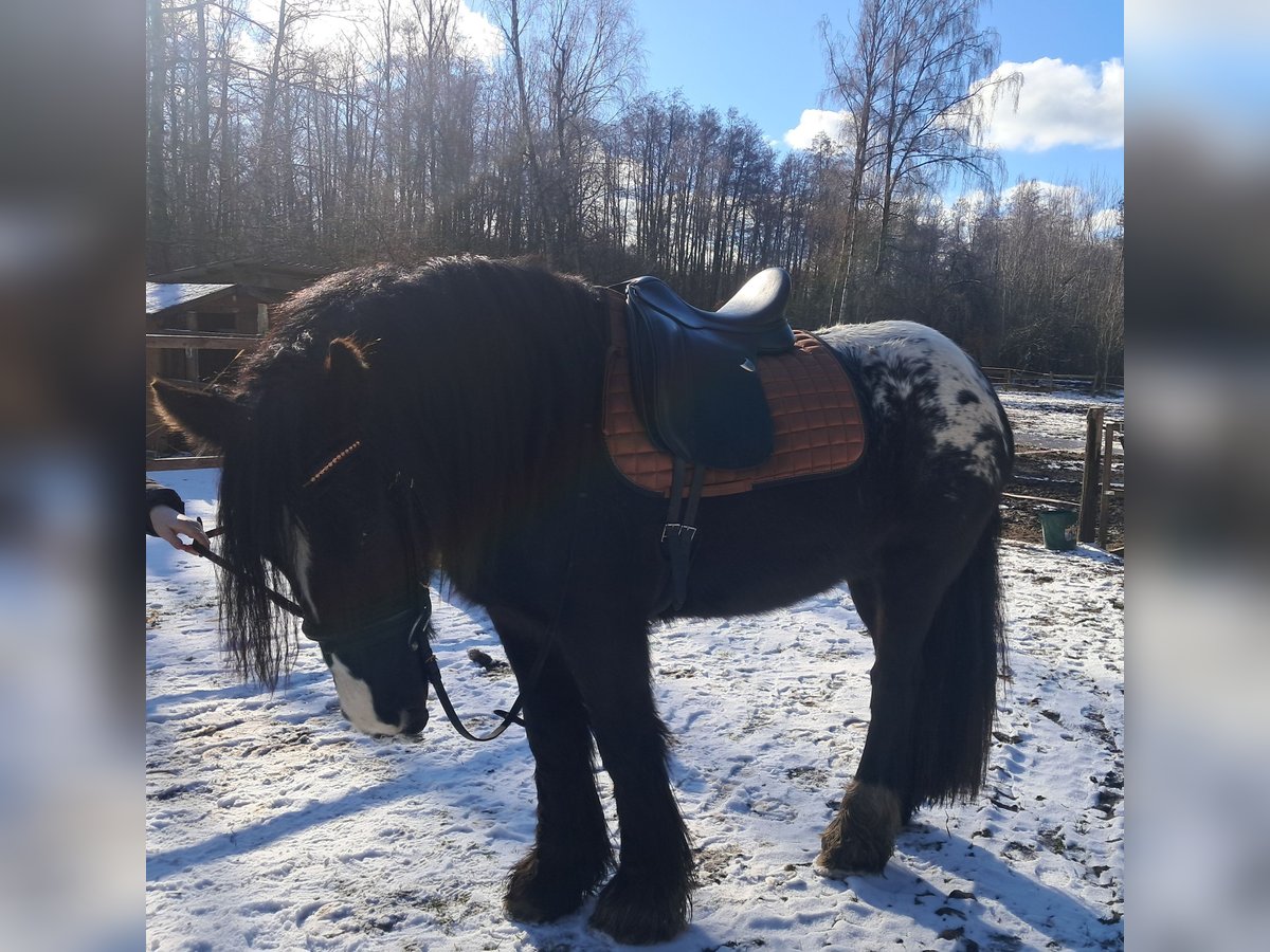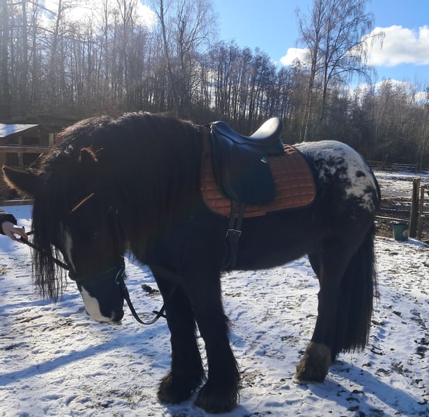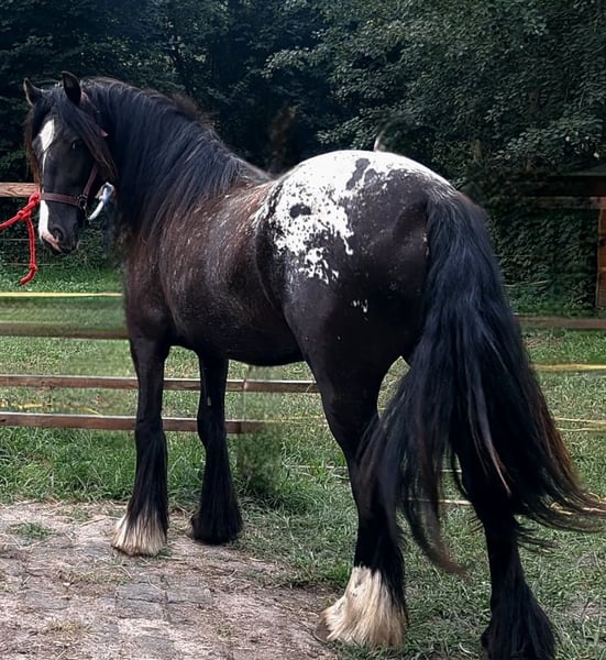 For sale: Tinker mare – Perfect for leisure riding! We are offering a beautiful Tinker mare, born in 2023. She impresses with her striking tobiano coat pattern (Smokey Black Appaloosa with tiger striped saddle blanket) and a friendly temperament. With a height of approximately 15.2 hands [still growing], she is ideally suited for recreational riding, shows, or breeding. The mare is healthy, well-socialized, and exhibits a very gentle nature in handling. Sold only with a final stable placement due to health reasons. This is not a distressed sale. Papers are from the ICS. Whether for long walks or simply to fall in love with – this young Tinker lady is a wonderful companion for anyone seeking a reliable and charming leisure horse. I have already led her around in walk with my daughter, and she remains calm. Otherwise, she is still quite raw, as she is still in her growth phase and needs time and care. Overall, she is very level-headed. Please feel free to contact me for further information or if you are interested!
