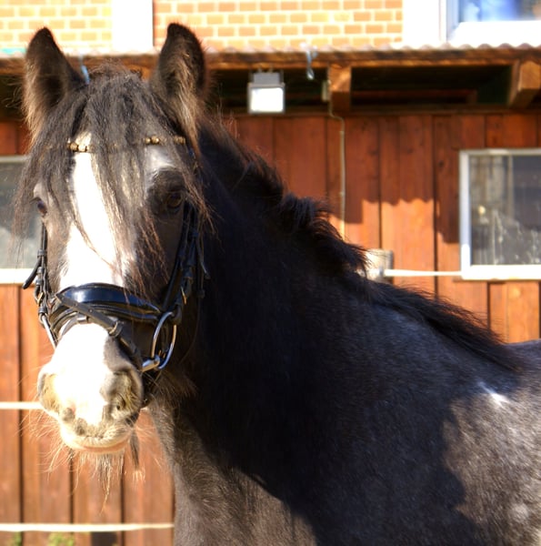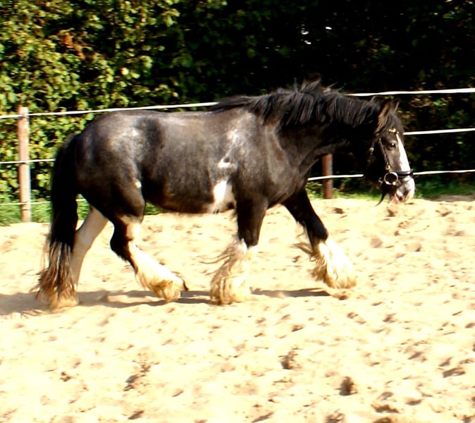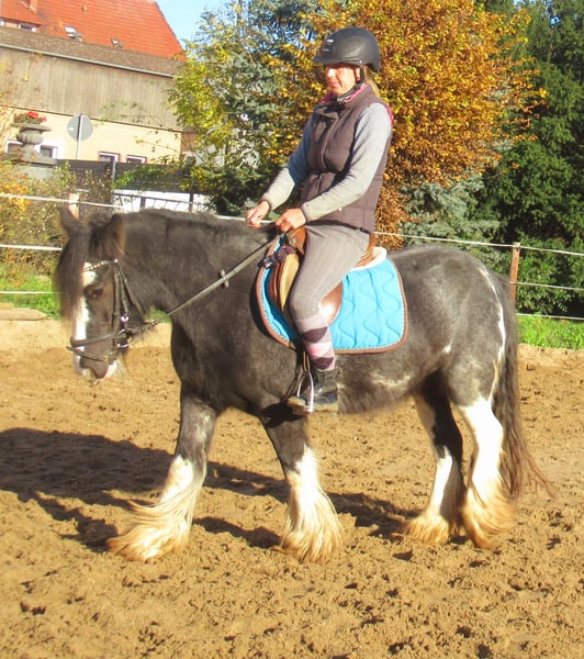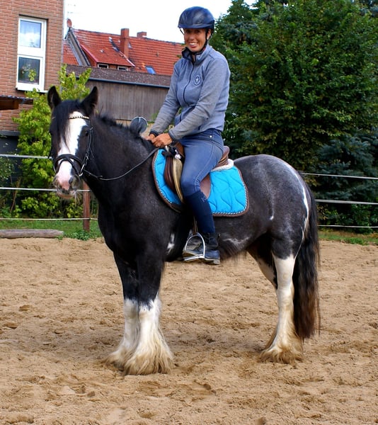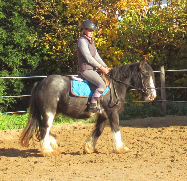 Knuffige black blagdon Tinkerstute, auffällige Optik mit schönem Exterieur, brav angeritten, hat Freude an Freispringen und springt auch mit toller Art, kennt Hunde und Traktoren, gibt brav Hufe, keine Rehe oder Mauke, artig im Umgang und unter dem Sattel