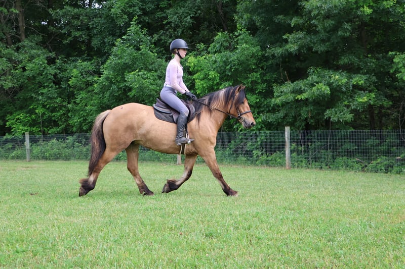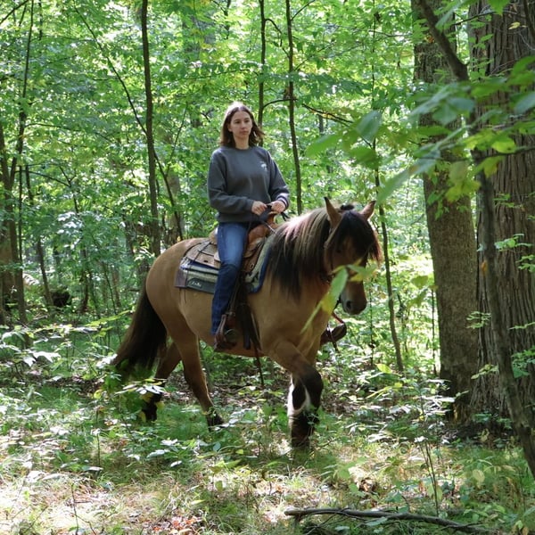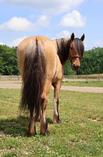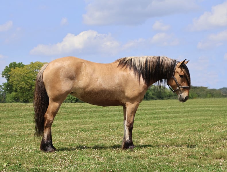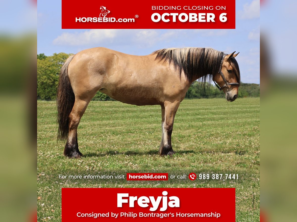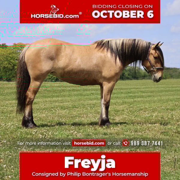 🍂 𝓐𝓾𝓽𝓾𝓶𝓷 𝑨𝑳𝑳 𝑺𝑻𝑨𝑹 𝑳𝑰𝑵𝑬𝑼𝑷 🍂 Happening now thru MONDAY | OCTOBER 6th - Available EXCLUSIVELY on HorseBid's website! For more details and to register visit: www.Horsebid.com CONSIGNOR CONTACT: Philip Bontrager's Horsemanship 989 387 7441 LOCATION: Howell MI BREED: Gypsy Vanner /Fjord REGISTERED: Yes REGISTERED NAME: ML Farms Freyja COLOR: Dunn HEIGHT: 14.3 AGE: 4 GENDER: Mare I am excited to introduce you to ML FARMS FREYJA, she's known as Freyja around the farm. As the old myth goes her name means the goddess of love and beauty. She lives up to her name with her beautiful deep dunn coloring, her extremely thick two tone mane and tail, her silky black feathers and her adorable muzzle that looks like she's dipped her nose in a glass of milk. Freyja is an extremely rare registered Gypsy Vanner (Fdtn Ldr TROOPER), Fjord cross (Sgf Kelley) She is 4 years old and stands a sturdy 14.3hh. This cross did not disappoint. From the beautiful feathering, mane and tail that Gypsys are known for to the dunn coloring, two toned mane and gentle demeanor fjords are famous for she truly has the best of both breeds. Freyja is well broke to ride. She will walk, trot and canter with ease. She knows both leads and has excellent transitions both upward and down. Freyja loves the trails and will go any direction you point her in. She's been thru our full desensitization program and has passed every test from flags to pool noodles, tarps and bridges with elegance and ease. Sitting on Freyja is about as comfortable as sitting on your favorite recliner. All of her gaits are smooth, steady and rhythmical. She's a delight to ride. On the ground she's extremely inquisitive. She is easy to catch in any size field and stands tied anywhere for anything. She has had 30 days in harness as well. In the arena she knows all lateral movements and has even been started over fences. She jumps in stellar form and will excel as a hunter. Freyja is a mare not only as pretty as a picture out of a book but has a mind to match. Please enjoy her video and take note of the various riders and places she's ridden in. Not only is she a delightful mare to ride she's a very rare cross that would produce some amazing babies!