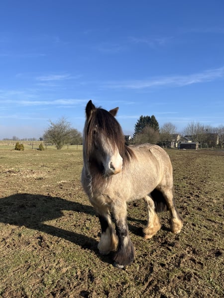 Jument Irish Cob de 7 ans toisant environ 1m55 avec une robe Isabelle. En ordre de vaccin, vermifuge, dentiste et parage. Cheval non débourré, non ferré mais manipulé. Elle a déjà eu quelqu'un sur son dos, avec une selle et avec un mors, mais le travail n'a pas été approfondi. Pas peureuse, à l’habitude d’avoir un tracteur, voiture, chiens, chats…dans son pré. En balade, elle n'a pas peur des voitures ou mobylettes. Elle est très fournit en crains. Très proche de l’homme. Elle adore qu'on prenne soit d'elle, elle vous accueillera en hénissant. Cheval devant impérativement vivre au pré toute l’année ! Elle ne partira que dans une bonne famille où elle aura un autre animal dans son pré (cheval, mouton ou autre, elle aime bien les autres animaux) Bérénice est une pure race, je suis la première propriétaire, elle est arrivée chez moi après son sevrage chez l'éleveur (Gent).