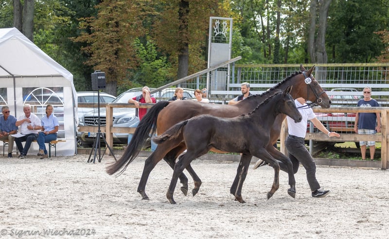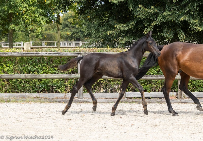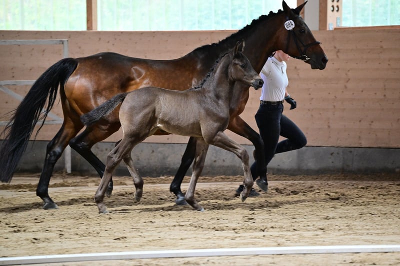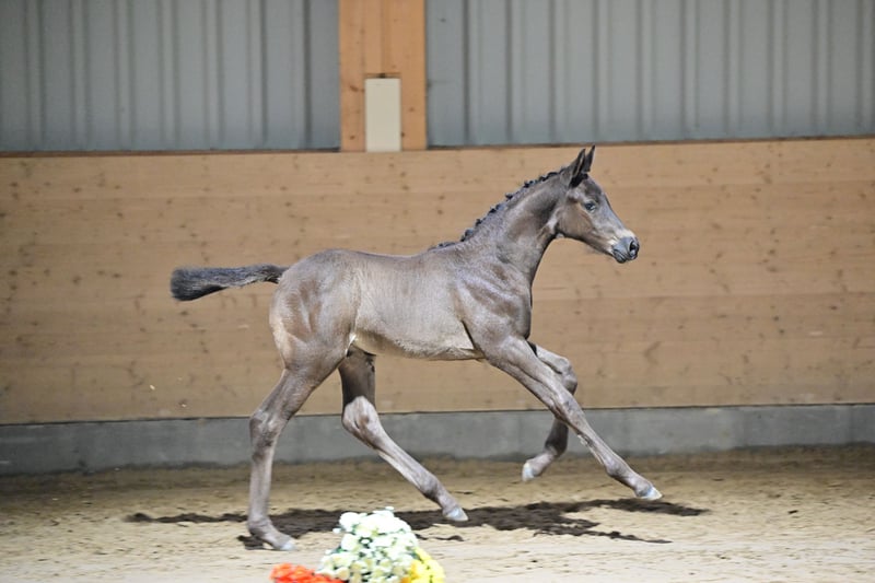 This likeable youngster reveals a cross-discipline performance pedigree of special style and quality. His sire Shapiro is himself highly successful in the advanced (S) level dressage arena and comes from one of the most prominent mare families in Trakehner breeding at present. Trakehner breed. Particular proof of this are several licensed siblings who have been successful in advanced (S) level dressage. Dam's sire Kasparow, also a multiple award-winner in advanced (S) level dressage tests and a son of the legendary Sixtus, has long since made a name for himself as an outstanding sire of sport horses. His great-grandsire Abdullah is a legend in show jumping and has won numerous medals at the Olympic Games and World Championships. Based on this proven bloodline, it is no coincidence that the full brother to the dam of this striking colt has already competed successfully in international eventing competitions. Another half-sister to the dam, the mare Manteca (by Impetus), is successful in advanced (S) level dressage, medium (M) level show jumping and eventing competitions. The direct maternal line also produced the licensed Manhattan, who is also successful in advanced dressage competitions. As one of the few sons of Shapiro who is only available via frozen semen, the typey and tastefully modeled colt can develop great appeal. With an energetic start and continuous uphill movement, this youngster develops a special athletic performance power. Long-legged and with a stable and correct foundation, he is also convincing from a conformation point of view. The harmonious overall appearance is rounded off by the exemplary state of development. A viewing of the foal is possible by appointment.