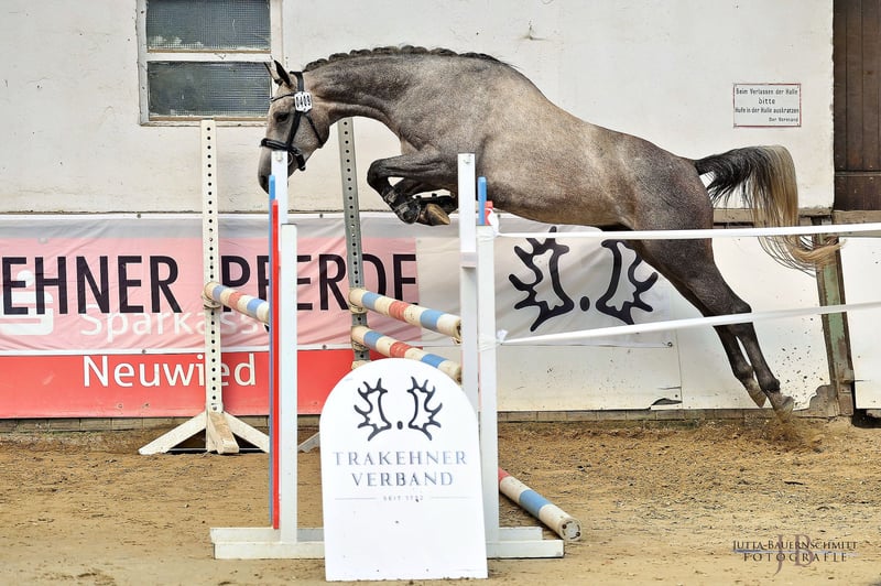 Rush Hour descend de Blancor - Hockey - Peron Junior - Symbol. Il a été monté pour la première fois cet été et est depuis retourné au pâturage pour continuer son développement dans le calme. Lors de ses premiers montes, il a toujours été très sage et a voulu faire les choses correctement. Grâce à ses origines, il possède à la fois d'excellentes allures de base et un potentiel de saut très élevé. Il est qualifié pour la Coupe de saut en liberté à Neumünster lors du marché des étalons de Trakehner, fin novembre 2025. Son père, Blancor, de la lignée d’Adorator, a été champion de cross-country pour jeunes chevaux de cinq ans en 2022. Il a terminé deuxième du concours complet international 100 TT. Côté maternel, Blancor appartient à l’une des lignées de juments les plus performantes et les plus couronnées de succès. Sa mère, Blanchette, est la sœur utérine de trois étalons approuvés et a également produit trois filles, toutes gagnantes en inspection d’élevage. Son fils Basmati a été sélectionné pour les Jeux équestres mondiaux de Tryon. Sa sœur utérine, Bisazza, est compétitive jusqu’au CCI**, tandis que Ballouette a obtenu des victoires et des classements en épreuves de saut en classe S. La lignée maternelle Hockey – Peron Junior – Symbol incarne également des aptitudes exceptionnelles en saut d’obstacles et en dressage. Les descendants de Hockey se distinguent par une mécanique de mouvement harmonieuse, un type classique et une grande polyvalence, aussi bien dans le sport qu’en élevage. Peron Junior est l’un des reproducteurs de dressage les plus remarquables dans la branche des Trakehner. Il se distingue par une origine sportive et a lui-même obtenu des victoires et de hautes places en compétition. Symbol a produit dans la race des Trakehner des descendants très maniables, dotés d’un bon potentiel saut et surtout très doués en saut d’obstacles. Âgé encore jeune, Rush Hour n’a pas encore été beaucoup développé. Il n’a aucune mauvaise habitude, se charge sans problème et reste très calme et nerveux. Il mesure actuellement 1,62 m et est encore en croissance. Vendu à un prix avantageux en raison d’un déménagement de l’élevage et d’une réduction de l’effectif.