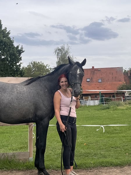 Zum Verkauf steht der vielversprechende Trakehner Wallach Cronos, ein eleganter Schimmel mit einer Größe von ca. 1,63 m. Cronos ist noch roh und steht am Anfang seiner Ausbildung. Dabei zeigt er sich sehr brav, gelassen und wenig schreckhaft. Im täglichen Umgang ist er unkompliziert und angenehm, sodass er eine ideale Grundlage für eine behutsame, pferdegerechte Ausbildung bietet. Bereits jetzt überzeugt er durch ein traumhaftes Gangwerk mit viel Takt, Schwung und natürlicher Balance – beste Voraussetzungen für Dressur oder vielseitige Förderung. 🧬 Abstammung Vater: Ivanhoe (Trak.) – von Millennium Mutter: Cima (Trak.) – von Leonidas Eine leistungsgeprägte Trakehner Abstammung, bekannt für Rittigkeit, Bewegungsgüte und Charakter. ✨ Hinweis Cronos hat einen kleinen Schönheitsfehler am Auge, der keinerlei Einschränkung für Gesundheit oder Nutzung darstellt. Ein ehrlicher, junger Wallach mit Qualität und viel Entwicklungspotenzial für Ausbilder, ambitionierte Reiter oder Liebhaber des Trakehner Pferdes.