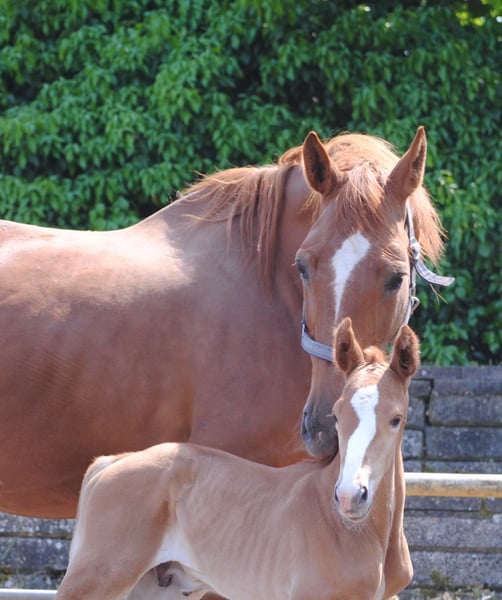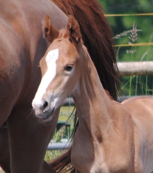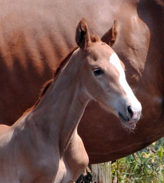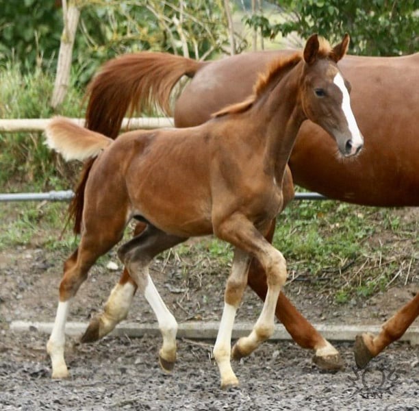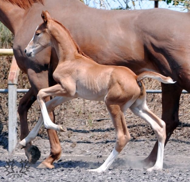 Kurz aufeinander fohlten die Lavinia-Töchter Lamara TN v. Elitehengst Goldschmidt und La Bardolina TN v. Elitehengst Dramatiker. Ihre beiden fuchsfarbenen Hengstfohlen, die von ihrer Machart, sowohl was Farbe und Typ als auch Bewegung angeht, können ihren Vater Le Chevalier TN nicht verleugnen. Der Hengst zeigt von Jahr zu Jahr in seinen Fohlen immer deutlicher seine Stempelqualität und erfüllt damit zuverlässig die an ihn gestellten Wünsche und Anforderungen. Lavinio TN versetzte uns durch seine enorme Größe und bemerkenswerte Knochenstärke ins Staunen als es endlich vor uns im Stroh lag. Bei seinem ersten Spaziergang fiel besonders sein wie in Zeitlupe gesprungener Bergauf-Galopp in die Augen. Trabmomente mit viel Knieaktionen lassen schon jetzt erahnen, was von dem kleinen ‚großen‘ Lavinio TN zu erwarten sein mag. Lavinio TN, geboren am 1. Juni 2023, v. Le Chevalier TN, in der attraktiven Dunkelfuchsfarbe verspricht auf Grund seiner kniebetonten Bewegungsmanier seines knochenstarken Fundaments und seiner Wüchsigkeit ein tolles Reitpferd zu werden. Auf der Fohlenschau wurde Lavinio als Drei-Sterne-Fohlen mit der Bestnote ausgezeichnet. Laut Beurteilung der Zuchtleitung ist auch eine Hengstanwartschaft nicht auszuschließen. Der Vater ist der einzige zuchtaktive Sohn des neuseeländischen Vollblüters Cavalleri xx. Seine Mutter, die Prämienstute La Bardolina TN stammt vom Elitehengst Dramatiker. Dieser springgewaltige Fuchshengst ist heute in China zu Hause. Auch der weitere fallende Stamm ist, unter Leistungsaspekten betrachtet, beachtlich zu nennen. Karo As v. Vollkorn xx, dann über Marduc und Mahon gehäuft arabische Gene sind Garanten für Leistung und Rittigkeit. Weitere Informationen über unser Gestüt finden Sie auf unserer Homepage www.gestüt-terranova.de.