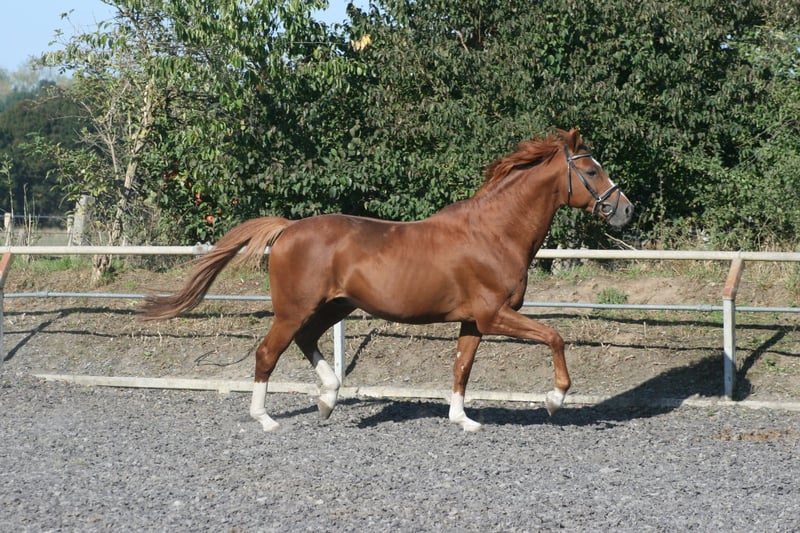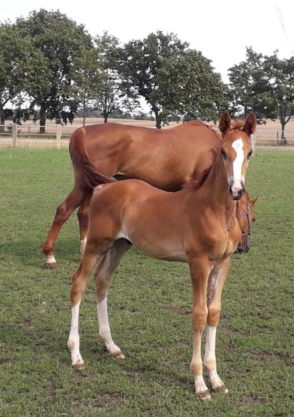 Peu de temps après, les filles de Lavinia, Lamara TN par le étalon d'élite Goldschmidt et La Bardolina TN par l'étalon d'élite Dramatiker, ont donné naissance. Leurs deux poulains de couleur alezane, tant par leur conformation que par leur couleur, leur type et leur mouvement, ne peuvent renier leur père Le Chevalier TN. L’étalon montre de plus en plus clairement sa qualité de marque à travers ses poulains d'année en année, répondant ainsi de manière fiable aux souhaits et exigences qui lui sont imposés. Lavinio TN nous a émerveillés par sa taille énorme et sa remarquable force osseuse lorsqu'il s'est enfin allongé dans la paille devant nous. Lors de sa première promenade, son galop en montée, semblable à un mouvement au ralenti, a particulièrement attiré l'attention. Ses moments de trot avec beaucoup d'action de genoux laissent déjà entrevoir ce que pourrait donner le petit 'grand' Lavinio TN. Lavinio TN, né le 1er juin 2023, par Le Chevalier TN, dans une séduisante couleur alezane foncée, promet d'être un excellent cheval de monte grâce à sa manière de se mouvoir accentuée par les genoux, son fondement robuste et sa croissance. Lors de la présentation des poulains, Lavinio a été récompensé comme un poulain trois étoiles avec la meilleure note. Selon l'évaluation de la direction d'élevage, une candidature pour étalon n'est pas à exclure. Le père est le seul fils actif en reproduction du pur-sang néo-zélandais Cavalleri xx. Sa mère, la jument primée La Bardolina TN, est issue de l'étalon d'élite Dramatiker. Cet étalon alezan, puissant en saut, est aujourd'hui basé en Chine. De plus, la lignée descendante est également remarquable en termes de performances. Karo As par Vollkorn xx, puis à travers Marduc et Mahon, des gènes arabes sont garantis pour la performance et la montabilité. Pour plus d'informations sur notre élevage, veuillez consulter notre site internet www.gestüt-terranova.de.