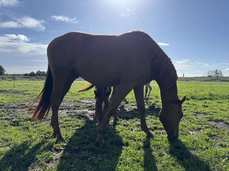 Preussenstokz: nickname Percy Is an elegant, fine, very people-oriented Trakehner, with a pedigree away from the mainstream. (full paper and awarded as a foal) He is well-behaved in dealing with (leading, blacksmith, veterinarian), extremely people-oriented, but also has a lot of temperament and a high urge to move. Nevertheless, he is not a beginner's horse and belongs in experienced hands. He's always up for a good time. Final dimension probably around 1.65 -1.67 He has been a gelding since March and has been stabled. So, foals already in the German Hengs type, a rearing as a stallion candidate was recommended. Absolute Outcross Pedigree! Sire: Mount Etna xx ( race tested and equipped with high riding horse points!) Dam: Passarella (elite contender) highly awarded, successful mare, with the noblest appearance! Multiple Austrian Champion in dressage - up to class S ( is also here at the stud and can be watched) Like his mother, he has an excellent foundation with large hooves, is intelligent and very motivated. He has a high urge to move and is a courageous horse. Like his parents, he has a talent for all disciplines or as an ambitious leisure horse for every discipline. Elastic, above-average but clear gaits with a lot of thrust from the hindquarters and a fundamental eagerness to learn make him an interesting young horse. Percy grows up on our private stud farm, sheltered and loving with a lot of human contact We muck out 2x a day (no mattress), 2x concentrated feed (Lexa Bio, Equistro mineral feed), hay 24/7, blacksmith every 8 weeks, deworm 4x a year. We attach great importance to top rearing in small groups. We would like Percy to have a great home, ideally for life. We are also happy to manage further breeding, including later castration, etc. Phone 0162 6976482