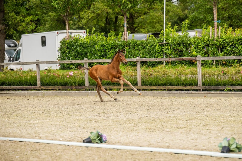 This tall stallion candidate and promising athlete gives reason to hope for a great future in eventing due to his extremely valuable genetics. His father, Tiago, was the best show jumping stallion of his licensing in 2023 and ideally combines the international course champions Cook du Midour AA and Iago C AA with the proven bloodlines of Hirtentanz and Humanus. The mother, Ashira, is descended from the legendary eventing sire Grafenstolz TSF, who consistently produces top horses and still ranks among the top 10 eventing sires in the WBFSH ranking. Furthermore, she is a half-sister to the CIC3* successful and former Bundeschampion of five-year-old eventing horses, Amazing Prince (by Prince Patmos). Energetic and powerful, this colt already made his debut at the Schleswig-Holstein Foal Championship, securing a place in the final ring. With an expressive face full of willingness to perform, he remained particularly calm in every situation, always rhythmically secure, diligent, and energetic in his movement. He impresses with his well-developed body parts, exemplary musculature, and an overall sporty appearance.