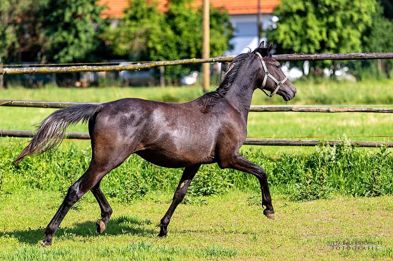 Zum Verkauf steht ein sehr bewegungsstarker Rappschimmelhengst von Janov (EH Heuberger/Normativ ox) a.d. Kreta (EH Connery/Lehndorff's). Bei seiner Fohlenbewertung konnte dieser typvolle Youngster bereits punkten und erhielt in Summe 57,5 Pkt. v. damaligen ZL Lars Gehrmann. Derzeit wächst er in profigerechter Hengstaufzucht mit gleichaltrigen in der Herde auf. Vater Janov ist erfolgreich bis Dressur S**; seine Mutter kann Erfolge in D/S/G bis Kl. L aufweisen. Dieser Youngster wird sicherlich später im Dressurviereck glänzen. Väterliche Geschwister bereits erfolgreich im Turniersport. Verkauf direkt vom Züchter https://trakehnerzucht-renate-steiner.de/konrad-s/ Bilder und Video aktuell von Ende Juni 2025