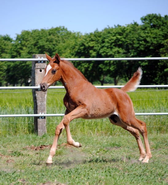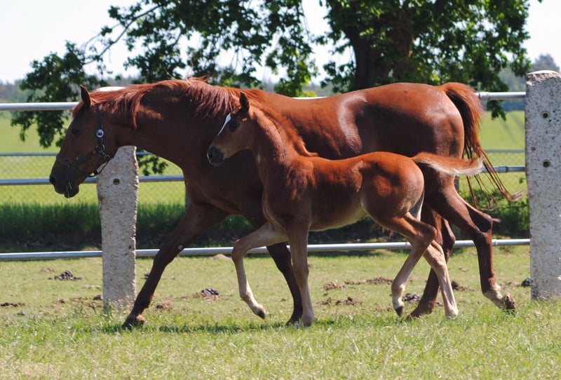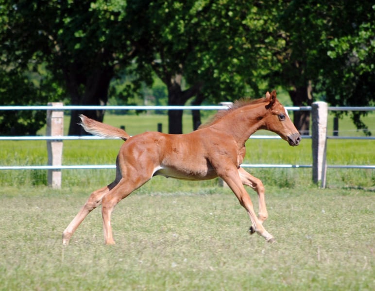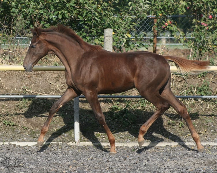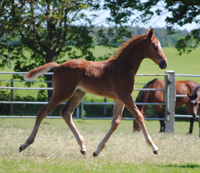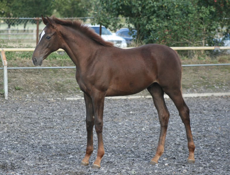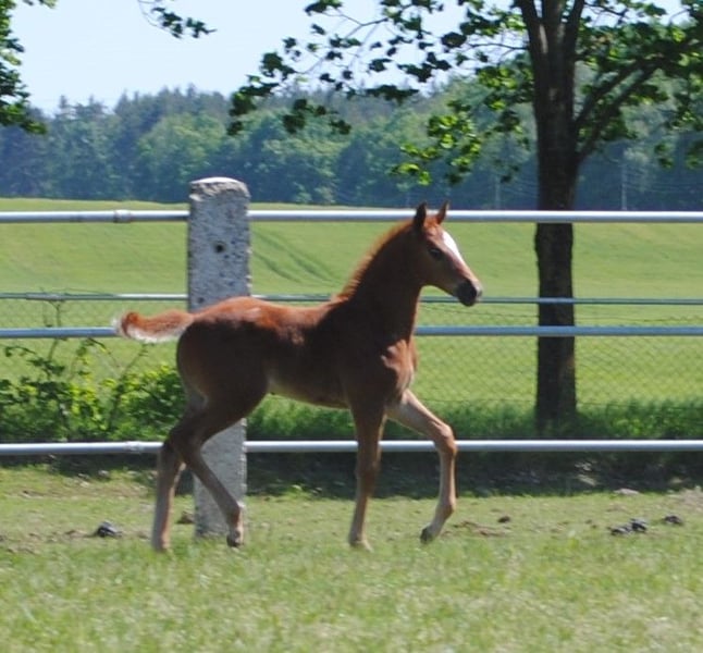 The colt, born on April 5, 2024, is a rarity due to his absolute outcross pedigree and his attractive dark chestnut color alone. He is a son of the Anglo-Arabian premium stallion Noupier x by Duke of Hearts xx and a daughter of the Olympian and World Championship participant in military sport Troupier x. Our "Le Noble TN" is in turn a son of the Pr.St. La Vita TN by Cavallieri xx - Vespucci (Ramzes x line), the full sister of our Pr.H. Le Chevalier TN, the sire was the winner of the performance test and also the winner of his stallion performance test for eventing horses in Marbach. This pedigree, his conformation, correctness and quality of movement led to the highest possible rating at the foal registration, the 3-star premium and the recommendation of the breeding management to raise him as a stallion.