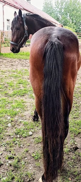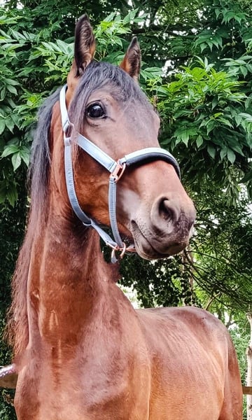This stunning young stallion is looking for his forever home. He was born on June 25, 2023, and is currently approximately 1.55 meters tall. He has incredibly long legs and already boasts a thick mane and tail. A show-off with style and endless charm, he knows how to make a statement to attract all eyes. With his big eyes and sweet expression, he captivates everyone he meets. He is expected to reach a final height of around 1.65 meters and has great potential for more demanding tasks. Already exhibiting impressive movement, a lively and floating trot, and a calm, uphill canter, he impresses at this early stage. A very confident young gentleman with a strong presence. He is already lunged at the halter, walks over a tarp, and enjoys jumping over a cavaletti. He is well-versed in basic foal training, regularly dewormed and vaccinated, and very social with other horses. This young stallion shows hardly any typical stallion behavior, is well-mannered, and knows how to behave. Experience in handling stallions or young horses should be sufficient. With the right partner by his side, a career in sport could certainly be possible. The parent horses can be viewed on site. He comes with a passport and pedigree documentation. We have a few videos, but they hardly do justice to his excellent gaits. Visiting and falling in love with him is the motto. A viewing appointment can be arranged, with a €15 fee for the introduction in the paddock, which will be deducted from the purchase price. We also have horses with various training levels available at the farm. If you're interested, please get in touch.