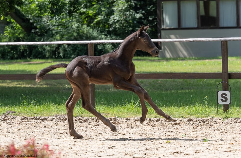 Modern colt with a lot of expression. On the occasion of his registration, this foal was admitted to the championships and was particularly appealing due to his modern riding horse appearance and flowing movements. The sire, E.H. Schwarzgold, himself successful in dressage up to advanced level, is now a guarantee for successful offspring in all areas of equestrian sport. The typey dam is from the first crop of Freiherr von Stein, who reached the final of the Bundeschampionat and is now a successful advanced level dressage stallion. The very narrow mare family of Zauberfee originates from the von Schöning family and is a guarantee for willingness to perform. The sport horses Zauberdeyk, Zauberruf, St.Pr.u.Pr.St. Zauberhexe, Zauberstab, the former Vice Bundeschampion Zauberfürst as well as the Bundeschampioness and participant in the World Championships for young dressage horses Pr.u.E.St. Zikade, all successful in the advanced (S) level, originate from this mare line. Through the granddam, St.Pr.u.Pr.St. Zaubernixe, the connection is made with the second performance line that has been cultivated by the von Schöning family for generations. E.H. Hirtentanz, who won advanced (S) level show jumping competitions, stands for willingness to perform, rideability and a human-oriented character. His dam, St.Pr.,Pr.u.E.St. Herzlani, passed one of the best performance tests of her time. Her dam, St.Pr.u.E.St. Herzchen, received numerous DLG and championship awards. An interestingly bred colt who, with the right support, has many options open to him!