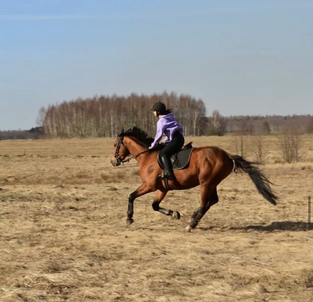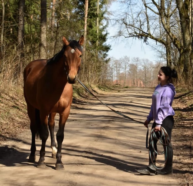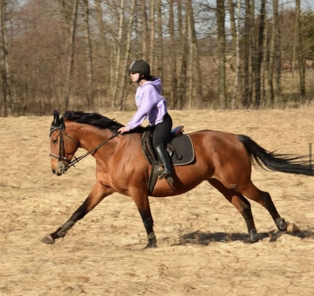 Hello, I am offering for sale the 7-year-old stallion shown in the photos above, with a good pedigree (castration can be arranged upon request). Key information: The horse is accustomed to being stabled with mares or other stallions and does not have any issues in this regard. He is well-trained and lightly ridden both under saddle and free, moving smoothly in all three gaits. During grooming and groundwork, he is safe and calm, neither kicking nor biting. He is suitable for a rider with good riding skills. He has been ridden exclusively by one rider so far and is not worn out, unlike horses used by multiple people. He has extensive experience riding alone in the countryside and is accustomed to traffic and dogs. Overall, the horse is well-behaved yet full of life. He is durable, recovers quickly, and has good jumping technique. He enjoys jumping obstacles and is not afraid of them. He would be an ideal choice for someone looking to develop and seeking their first horse for small-scale sport. For more information, please contact me at +48 531 315 600. Or better yet, arrange a viewing and a test ride!