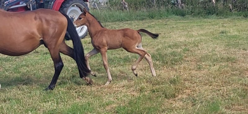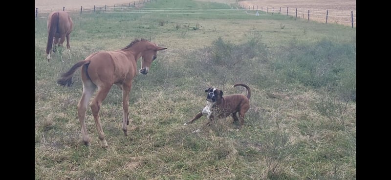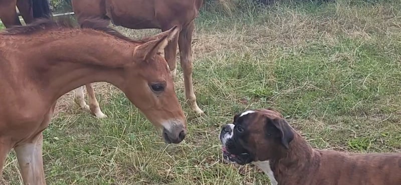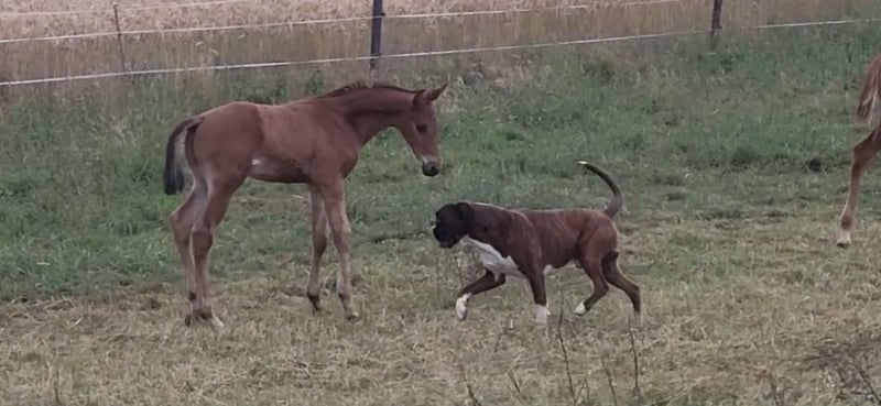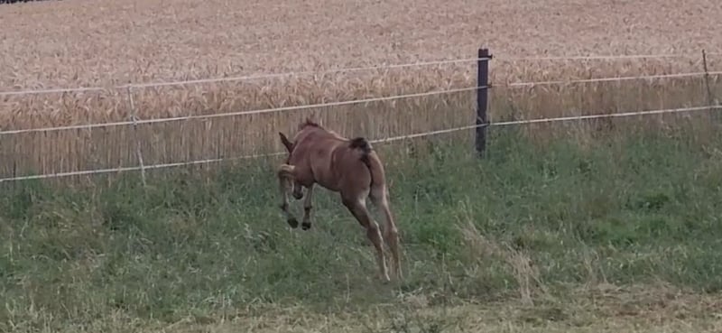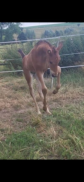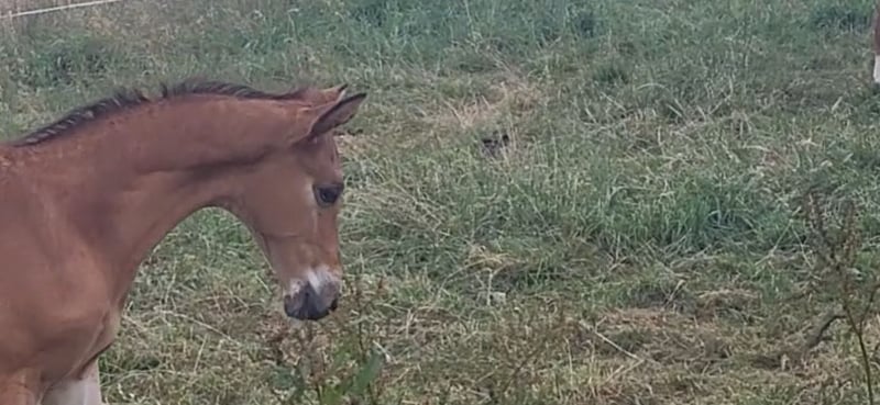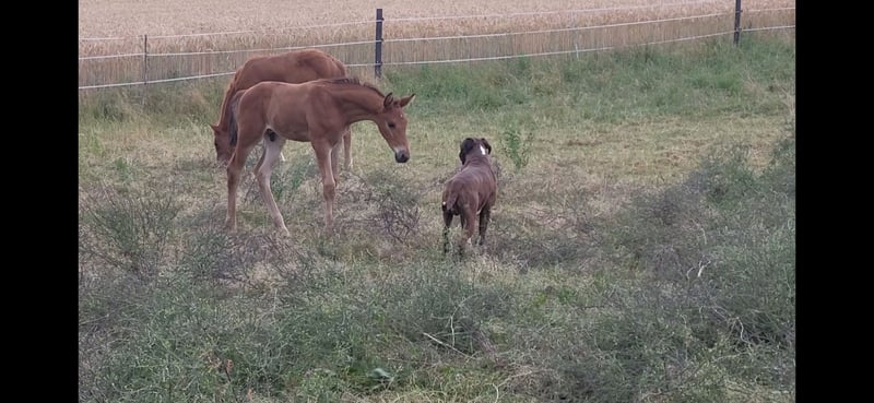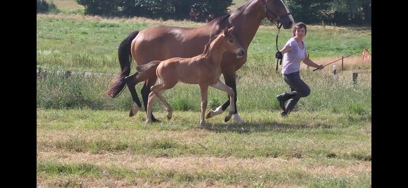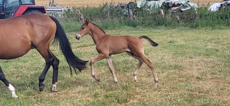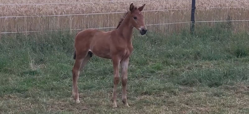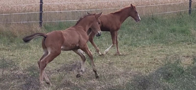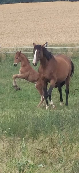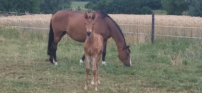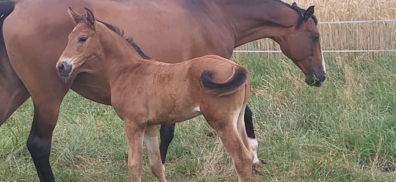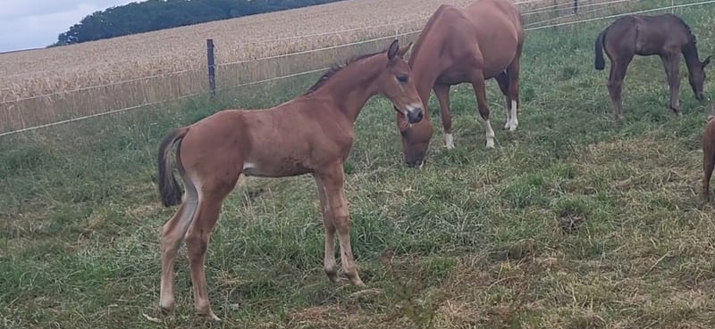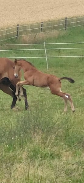 Tolles Hengstfohlen von Glücksruf (selbst international Vielseitigkeit gegangen) aus der Taira von Hirtentanz. Tryon II ist ein toll bemuskeltes, typvolles Fohlen mit 3 ordentlichen Grundgangarten. Sehr verschmust und trotzdem wach und neugierig. Die Mutter Taira ist verletzungsbedingt nur bis L Springen platziert, aber mit ihr wäre ich alles geritten. Sie hatte eine super Einstellung, tolle Manier und wollte nie einen Fehler machen. Taira ist Vollschwester zum gekörten Tarison und Taira ist ebenfalls Mutter vom besten Springhengst der Körung 2023 Tiago. Tairas 1. Fohlen Tattoo ist 5 jährig und ist altersentsprechend in der Schweiz in Dressur- Spring- und Vielseitigkeitsprüfungen platziert(ein richtiger Schleifensammler). Letztes Jahr war der Vollbruder Tryon zweitteuerstes Fohlen auf der Auktion (siehe Youtube Link). Tryon II ist ganz eng verwandt zum amerikanischen Vielseitigkeitspferd Tsetserleg und zu den gekörten Hengsten Tecumseh Tempelhof und Tschaikowsky. Ein 2 jähriger Vollbruder kann auch noch bei mir besichtigt werden