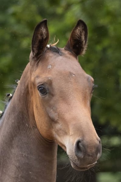 This dark brown stallion, born in mid-March, exudes masculinity and has a noble appearance. He is very well-muscled and has a powerful, consistently correct gallop. His walk is above average in terms of reach. The trot is presented with clear rhythm and looseness. During his assessment, his conformation and gaits were evaluated in the premium lot. In temperament, he is very friendly and approachable. He is lively and healthy. His sire, PREUSSENPARTY, is a breeding sensation at just 7 years old. He has already produced sought-after auction foals and mares, premium and champion mares, as well as a licensed son. In his pedigree, his grandfather MILLENIUM and great-grandfather SCHWADRONEUR form a highly interesting combination. His dam, ROSANNA, comes from the family of O314 Renette, which boasts a multitude of successful offspring in both sport and breeding. Notable examples include RENAISSANCE FLEUR under Monika Theodorescu, the licensed stallion RHENIUM, or the Austrian vice-champion in eventing, ROMBINUS. She herself completed the SLP at three years old with a score of 7.70 and made it to the premium final ring at the central mare registration in Hanover.
