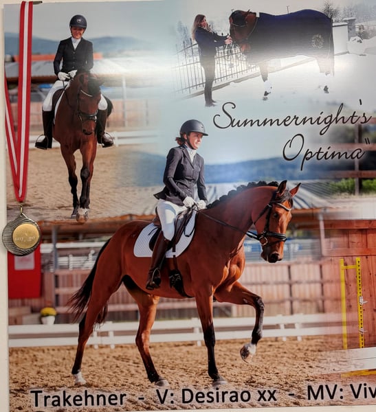 „Summernight’s Optima“ ist eine blutgeprägte, leistungsbereite und sehr routinierte Stute, die zahlreiche Erfolge in Vielseitigkeitsprüfungen auf A-L-Niveau vorweisen kann. Sie zeigt viel Talent am Sprung und überzeugt im Gelände mit Geschick, Übersicht und einem hohen Maß an Verlässlichkeit, weshalb sie eine interessante Offerte sowohl als Umsteigerpferd als auch als verlässlicher Freizeitpartner darstellt. Zudem ist sie als Prämienstute im Trakehner Verband eingetragen und wurde seinerzeit anlässlich der zentralen Stuteneintragung als beste Spring- und Halbblutstute ausgezeichnet. Damit stellt sie ebenfalls eine interessante Option für den züchterischen Einsatz dar. Über ihren Vater, den Vollblüter Desirao xx, sowie über die im mütterlichen Stamm folgenden Vererber Vivus und Grossist vereinen sich beste Leistungsgene, die die Sportlichkeit und Leistungsbereitschaft von Summernight’s Optima eindrucksvoll unterstreichen.
