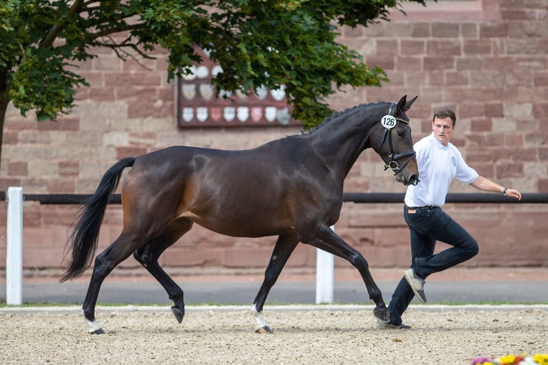 Mit der Prämienstute Perserkrone wird hier eine äußerst qualitätsvolle Stute aus dem wertvollen Stamm der Pelargonie (Hauptgestüt Trakehnen) angeboten. Sie war Reservesiegerin ihrer Eintragung und legte die SLP mit der guten Note 7,84 ab. Krönchen überzeugt durch drei überragende Grundgangarten, die stets geprägt sind von energischem Abfußen mit viel lockerem Grundschwung, Kadenz und Gleichmaß. Aufgrund ihrer großen Qualität und Rittigkeit wäre auch eine reiterliche Verwendung gut denkbar; Ausbildungsstand ist die Anforderung der SLP. Bisher zur Zucht eingesetzt, brachte Krönchen in vier Zuchtjahren vier absolut typ- und bewegungsstarke Fohlen zur Welt, die sich ausnahmslos durch eine auffallend freundliche und ausgeglichene Art auszeichnen. Tragend werden, Trächtigkeit und Geburt verliefen bisher völlig komplikationslos. Der Umgang mit den Fohlen ist sehr mütterlich und von viel Übersicht geprägt. Auch das Verhalten in der Herde ist vorbildlich. Aktuell ist Krönchen erneut tragend von Kenneth; Abfohltermin ist Ende Mai 2026. Das Pedigree lässt keine Wünsche offen: Silvermoon, der auch als Vater u.a. der international erfolgreichen Stute Blue Horse Matiné seine Vererbungskraft eindrucksvoll unter Beweis gestellt hat, kann selbst zahlreiche Erfolge in Dressur Kl. S vorweisen und verbindet sich hier mit den auf der internationalen Grand Prix-Bühne erfolgreichen Hengsten Monteverdi und Friedensfürst. Die mütterliche Genealogie ist mit Perserfürstin, Perkallen und Pilkallen geprägt von hoch prämierten Spitzenstuten besonderer Machart aus dem Stamm der internationalen GP-Stars Partout und des olympischen Bronzemedaillengewinners Peron. Krönchen wird nur aufgrund platzbedingter Verkleinerung der Zucht in gute Hände abgegeben.