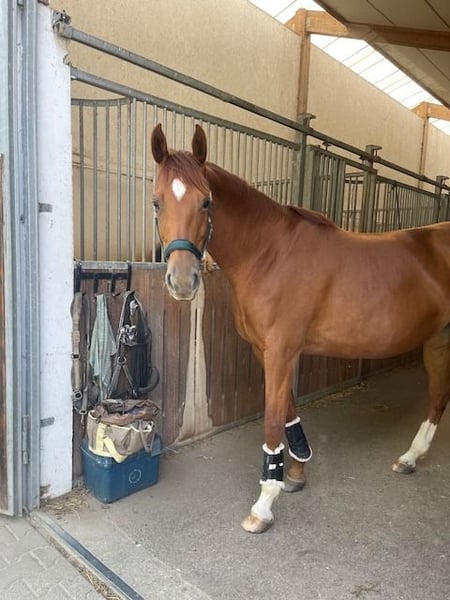 Wir suchen für unsere Stute ein 5**** Zuhause. Sie ist der optimale Freizeitpartner für Pferdemenschen, die nicht täglich in der Halle oder auf dem Platz reiten möchten. Sie ist perfekt für alle, die gerne ins Gelände gehen, lange Spaziergänge machen, Spaß an der Bodenarbeit und an Gelassenheitsparcours haben. Wer sein Kind oder Enkelkind langsam und sicher an den Umgang mit dem Pferd gewöhnen möchte, ist bei ihr genau richtig. Jeder, der einfach eine ganz tolle Begleiterin in der Freizeit sucht, darf sich gerne bei uns melden. Ambitionierte sport-und Freizeitreiter sollten weiterklicken. Ranke ist eine wunderschöne Trakehnerstute und hat wirklich ein Herz aus Gold. Da sie sich, vermutlich schon im Fohlenalter, eine Verletzung am Nackenband zugezogen hat, die sie nicht sonderlich beeinträchtigt, verkaufen wir sie als bedingt reitbar. Sie geht für Ihr Leben gerne ins Gelände (egal ob mit oder ohne Sattel), badet und planscht im Bach. Leicht Arbeit in der Halle, sowie kleine Sprünge unter dem Reiter kennt sie ebenfalls. Dabei zeigt sie sich brav aber temperamentvoll = daher KEIN Anfängerpferd. Sie hat keine Unarten wie Steigen, Bocken, wildes Durchgehen, etc. aber Trakener eben. In der Bodenarbeit zeigt sie sich sehr bemüht alles richtig zu machen und beim Gelassenheitstraining siegt bei ihr immer die Neugier, statt der Angst... 2023 und 2024 hat sie uns 2 bildschöne Stutfohlen geschenkt. Beide bewegen sich toll und sind charakterlich ganz die Mama. Sie steht bei uns mit 3 weiteren Stuten auf der Koppel und ist auch hier sehr sozial und artig. Es handelt sich hier um keinen Notverkauf!!! Bitte nur ernsthafte Anfragen! Bitte kontaktieren Sie mich nur telefonisch (werktags ab 13 Uhr) oder per WhatsApp.