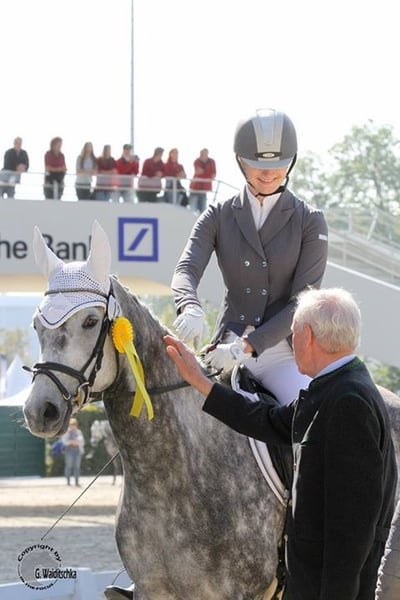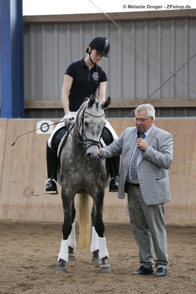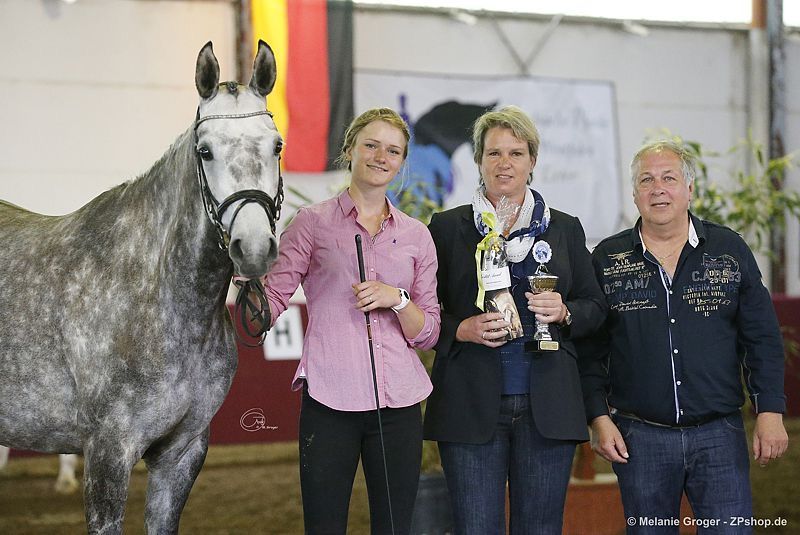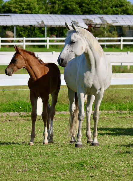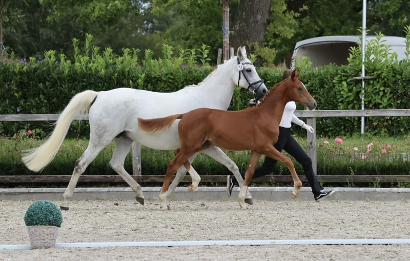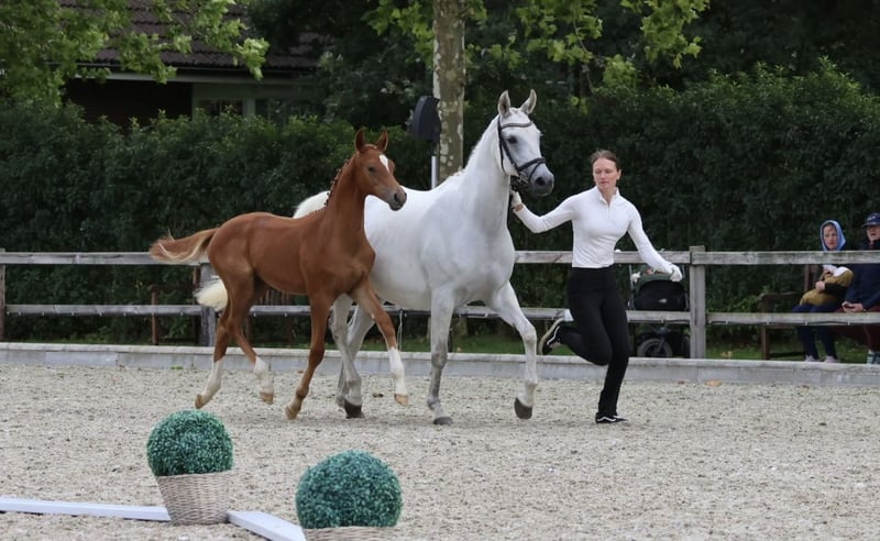 Estopia hat eine gute SLP, siegreich in Reitpferde und A-Dressur. Aufgrund ihres sanftmütigen Wesens lief sie 2 Jahre in unserer Reitschule - auch mit Anfängern. Nach einem gelungenen Fohlen (v. Adorator) wurde sie als Freizeitpferd verkauft. Dort verletzte sie sich und wir nahmen sie als Zuchtstute zurück. Sie ist lahmfrei, fröhlich und dürfte noch gemütlich ausgeritten werden. In 2025 bekam sie ein traumhaftes HF von unserem Bahrain, was Endringfohlen der Hengste und Champion der Fohlen mit Vollblutanteil wurde Preis ist für nicht gedeckt. Sie wird im April sonst erneut mit Bahrain besamt, dann steigt der Preis