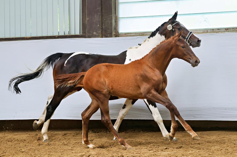 His sire Grenoble is a true crowd-pleaser—not only because of his aesthetically pleasing pinto markings but also due to his top-class rideability. Recently exported to the USA, he now aims for a successful career in the demanding hunter discipline. It is hard to believe, but RW impresses with an excellent temperament and consistently demonstrates a high level of athleticism, combined with a typy and feminine appearance, as well as harmonious conformation and expressive, rhythmical movements marked by tact and clarity. His dam is among the best daughters of the pinto stallion Camaro, who proved his worth in challenging eventing competitions and was also regarded as a crowd favorite thanks to his excellent character and outstanding rideability. On the maternal side, he descends from the S-dressage successful premium stallion Lowelas (Canada) and the legendary dam line of the main stud farm’s distinguished mare Kokette by Cancara.