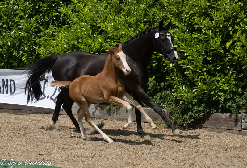 Father Rockingham not only showcases a convincing debut as a sire but also impressed at every start in age-appropriate competition tests - a record crowned by the title of the reigning "Trakehner Dressage Champion" and qualification for the Bundeschampionat of the German Dressage Horse. His daughter appears like a true princess, attractively marked, noble, and feminine, with particularly harmonious body parts. She moves off the spot diligently and energetically, makes herself big while doing so, never loses her rhythm, and captivates with both relaxation and impulsion. The highly awarded mother is one of the few daughters of the S-dressage successful Hancock and represents a top lineage from which numerous breeding and sport elites have emerged in close relation. Breeding and sport are exemplarily combined here. Inquiries are welcome via email at: couralou@t-online.de.