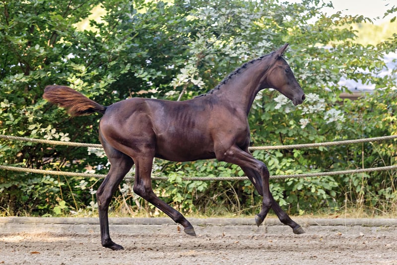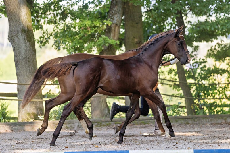 A well-thought-out pairing with a successful outcome, this show jumping-oriented filly boasts an attractive dark coat. She is comfortably built, with a long neck and a good topline. Still in growth, she has plenty of leg and a modern, athletic silhouette. It is already evident that the foal will surpass its dam in both frame and size. The combination of Arizonas x Phlox is characterized by great desirability and genetic reliability. As a son of the legendary parcours hero Almox Prints, Arizonas possesses top-quality jumping ability himself, and the well-bred damline mare, Phlox, was also successful in show jumping up to S level. Here, true performance is developing.