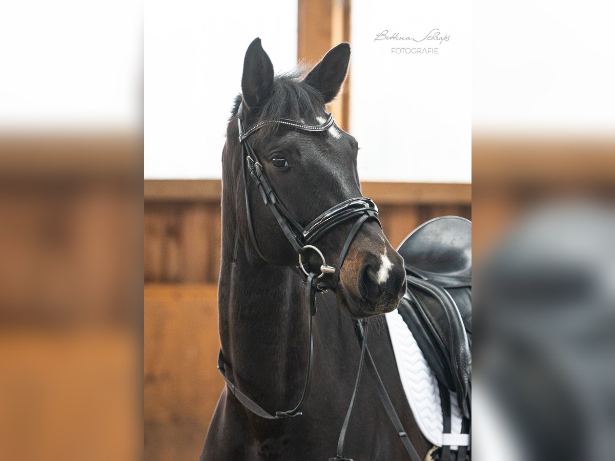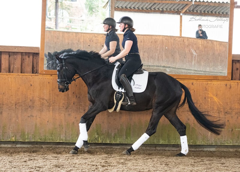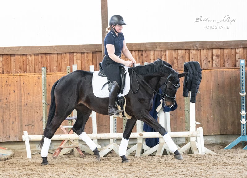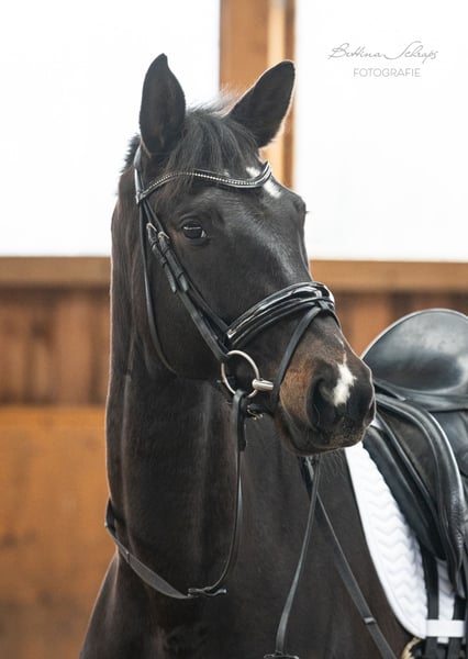 Urania was backed as a four-year-old and then given time to mature. She has been ridden consistently for the past quarter of a year and is very cooperative, making daily progress. In addition to dressage work, she is also ridden in the field and has already begun jumping over colorful poles and small cross-country obstacles. Her sire, the elite stallion candidate Ganderas, was already placed in S-Dressage at the age of seven. The YouTube video shows him competing in an S-Dressage test. Her dam was awarded premium mare status by the Trakehner Verband and was the winner of her mare performance test. Her pedigree also includes the renowned S-Dressage stallions E. H. Hofrat on the sire’s side and E. H. Easy Game on the dam’s side, both tracing back twice to the legendary E. H. Gribaldi. Urania is an absolute sweetheart in handling and shows no bad habits. She is familiar with pasture, open stall, and box, and has been lunged on the lunge line. In summer, she shows minor signs of eczema, which are perfectly managed with a fly sheet during turnout. We are looking for a family with experience in young horse training for our very people-oriented Urania. Due to her age and training level, she is definitely not suitable for beginners, although she is incredibly sweet. She is being sold on behalf of the breeder. X-ray images are available and can be sent upon request.