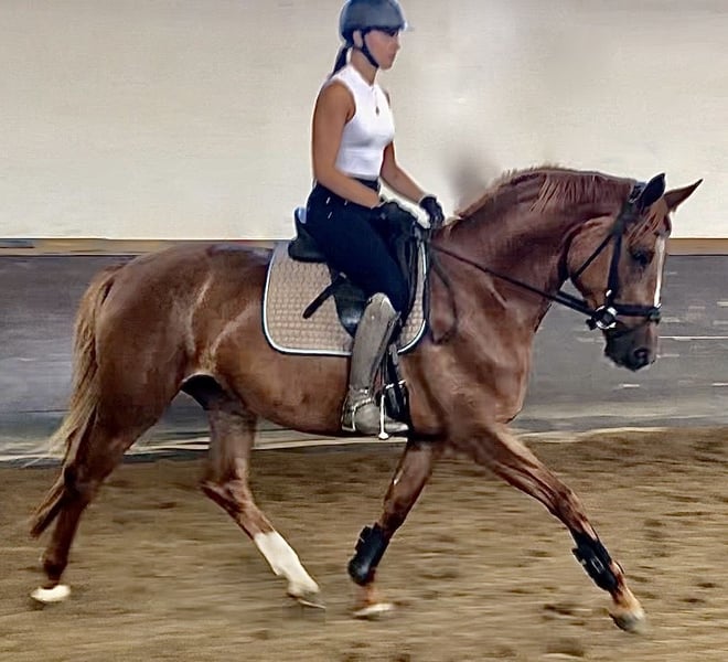 Hailey is a stunning, noble chestnut mare. In May/June 2024, she was lunged and introduced to the saddle and rider. Afterwards, she spent another year in the stable and on the pasture, as she was born late in the season. From July 2025, she was backed and started under saddle with the Bavarian Breeding Association in Munich-Riem. Impressions from the foreign rider test during her mare performance test (after 7 weeks of training!). See video! Performance test evaluations include: Character 10.0; Temperament 9.0; Willingness to perform 9.5; Conformation 9.0 Hailey is rideable (and comfortable to sit), friendly, and well-behaved. Health condition = top fit. X-ray images from August 26, 2025: no findings! Hailey’s pedigree: Sire: P.H. Karim Dorè (see attached picture – chestnut stallion) On her sire’s side, she descends from the Grand Prix dressage horses E.H. Imperio and E.H. Insterburg – the highest-rated Trakehner “Star” sires of 2025, ranked 1st and 2nd. Dam: St.Pr. and Pr.St. Hetidze v.H. (see attached picture – Rapp mare) On her dam’s side, the Trakehner stallions E.H. Monteverdi and Ibikus guarantee excellent riding horse qualities. Hailey’s very good general impression (see video at the longe line) continues to be developed – now under the rider. Hailey can be tested under saddle at any time. For inquiries and to arrange a viewing, please contact her rider and trainer, Kathrin Reisinger, at: +49 173 2732008.