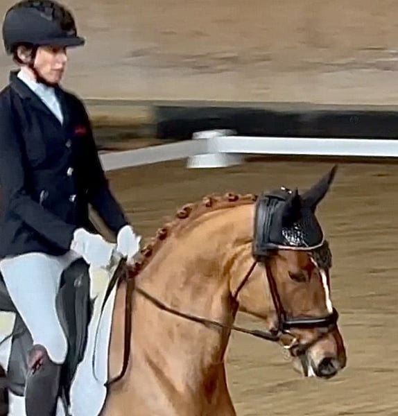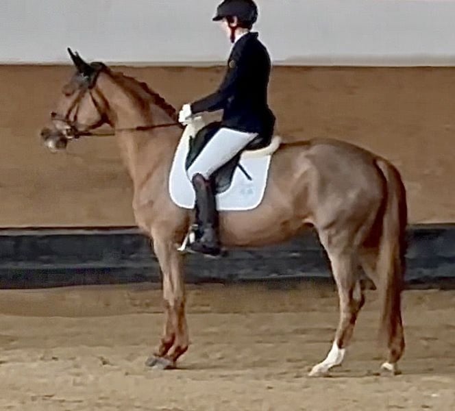 Il 9 novembre 2025, Hailey ha partecipato per la prima volta a una prova di equitazione per cavalli da dressage. (vedi il video attuale). Hailey è una splendida e nobile cavalla rossa. È facile da montare (e ben seduta), socievole e tranquilla. Cerca il contatto con le persone (è una cavalla affettuosa) e si comporta amichevolmente con gli altri cavalli. Rimane calma, ad esempio, quando viene montata da sola nella scuderia o nel paddock esterno – anche quando altri cavalli vengono lavorati contemporaneamente. Tra maggio e giugno 2024 è stata messa in longe e abituata alla sella e al cavaliere. Successivamente, è tornata in stalla e al pascolo per un anno, poiché nata tardi. Ad agosto/settembre 2025, Hailey ha partecipato alla prova di prestazione per puledre presso il Verband Bayerischer Züchter a Monaco-Riem. Ha ottenuto un punteggio di 7,9 nella parte dedicata alla dressage! Valutazioni della prova di selezione, tra le altre: Carattere 10,0; Temperamento 9,0; Disponibilità al lavoro 9,5; Costituzione 9,0 Stato di salute = in perfetta forma. Raggi X del 26/08/2025: molto buoni, senza riscontrare anomalie! Linee di sangue di Hailey: Padre: P.H. Karim Dorè – ha vinto la classe M di dressage all’età di 6 anni. (vedi l’immagine allegata – stallone rossonero). Inoltre, il suo pedigree paterno include i cavalli da Grand Prix E.H. Imperio ed E.H. Insterburg – i due Trakehner “stelle” più valutati nel 2025, rispettivamente al primo e secondo posto. Madre: St.Pr. e Pr.St. Hetidze v.H. – ha vinto la classe M di dressage. Addestrata fino a S-Dressage, purtroppo si è infortunata, diventando poi una cavalla da riproduzione di successo. (vedi immagine allegata – cavalla baia). La sorella maggiore di Hailey è la vincitrice di S-Dressage, St.Pr. e Pr.St. Hadiya, da Grand Prix H. Schwarzgold e dalla stessa madre, St.Pr. e Pr.St. Hetidze v.H. Hailey può essere provata in sella in qualsiasi momento. Per un provino di monta presso l’impianto di Waakirchen, si prega di contattare e concordare un appuntamento con l’istruttrice e amazzone Kathrin Reisinger. Cellulare: 0173 2732008.
