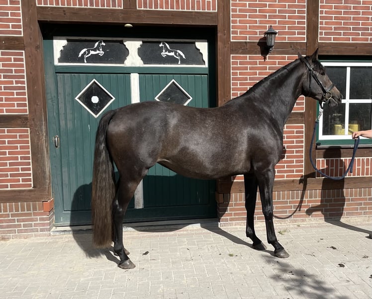 This young mare combines dressage potential, versatility talent, and an excellent pedigree. Clear in her mind, strong in her movement - a true prospect for sport and breeding. She is ready for her role as a riding horse, absolutely cool and affectionate, she will become a great partner for sport, leisure, and breeding. She has already started with light work. Her father passes on his traits decisively, alongside top character, very good rideability, and nerve strength, of course, also very good gaits and jumping ability. Her mother is a premium mare with racing performance and produced her first foal, which was immediately awarded. Two other full siblings have been awarded the highest premium of their year. Thus, she is also a highly interesting future breeding mare!