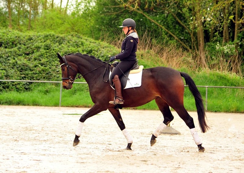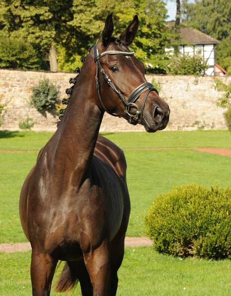 3-letnia Valentiana to bardzo atletyczna młoda klacz z dużą ilością nóg, dużymi elementami, trzema bardzo taktownymi i dobrymi podstawowymi chodami. W skoku pokazuje dużo przeglądu, radości, umiejętności i manier. Wyposażona we wspaniałe wnętrze! Jest łatwa w obsłudze i już imponuje rytmem i delikatnym, lekkim zachowaniem pod jeźdźcem. Na naszych młodych koniach jeździmy bardzo spokojnie i celowo unikamy ekscytujących występów. Jej ojciec His Moment był czempionem ogierów na licencjach trakeńskich i jest ojcem trzech licencjonowanych ogierów i różnych czempionek. Jego potomstwo również wyróżnia się w sporcie. Jej matka Valentine jest bardzo nowoczesną córką elitarnego ogiera TSF High Motion z krótkimi sukcesami w Grand Prix i wnuczką Showmastera z wieloma sukcesami w Grand Prix i Grand Prix Special. Od tego czasu Valentine wydała na świat kilka bardzo utytułowanych źrebiąt. Jest półsiostrą odnoszącego sukcesy na poziomie zaawansowanym ogiera ujeżdżeniowego Valpiano, a także klaczy premium Vittoria, Veruschka, Vitalia I i II oraz Valenta. Rodzina klaczy Vilja po Julmond z Hämelschenburga obejmuje sprawdzone ogiery Van Deyk (Grand Prix), Vincent, Valerian (zwycięzca HLP, ujeżdżenie na poziomie zaawansowanym (S), wkkw) i Velasquez (skoki przez przeszkody na poziomie średnim (M)), a także mistrza świata w wkkw Petera Thomsena - Vilano.