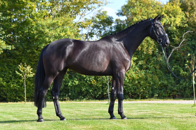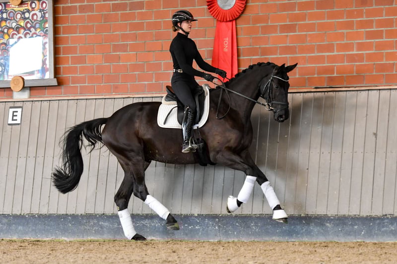 This very impressive black mare with a refined frame and presence also fills the large arena. Her conformation is exceptionally well-built, standing on a solid foundation. Despite being well and long matured, she still has plenty of development ahead of her. She is straightforward to ride and comes from a pedigree of the highest caliber: full sister to the champion stallion Kaiser’s Erbe, three-quarters sister to the champion stallion Kaiser Milton, and full sister to his licensed full brother Kavalli. She is also a half-sister on the sire’s side to TSF Dalera BB and Millennium. Her dam, Kaiser’s Els, is a full sister to the licensed Grand Prix brothers Kaiserkult and Kaiserdom, as well as their full brother Kaiseradler, who remains successful at Grand Prix level even in advanced age. These references are truly hard to beat.