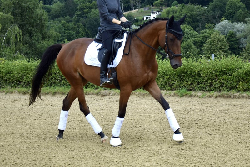 Donatella è una cavalla trakehner di colore baio, nata nel 2020 e alta attualmente circa 165 cm, figlia di Burma Gold xx x Cavallieri xx x Hohenstein. La sua ascendenza e tutti i fratelli di questa linea suggeriscono una versatilità di utilizzo. Attualmente, Donatella è in fase di addestramento delicato e versatile. Da sottolineare è la sua disponibilità al lavoro e la predisposizione al salto. Salta già un completo percorso A, dimostrando coraggio, cautela e visione, e possiede potenziale per compiti di livello superiore. Ha anche già accumulato le prime esperienze nell'addestramento al cross e si raccomanda per il completo con ulteriore formazione. Anche nel lavoro di dressage, Donatella offre grande soddisfazione al suo cavaliere. È sempre motivata, desidera fare tutto nel modo giusto e impara rapidamente. Tutte le lezioni del dressage per cavalli di livello L non le sono estranee. Non ha mai scalciato sotto il cavaliere e trasmette sempre una sensazione di sicurezza durante la monta. Donatella ama l'attenzione e colpisce per il suo carattere amichevole, curioso e intrepido. Per rilassarsi, esce regolarmente da sola o in gruppo al passo, trotto e galoppo. La cavalla trakehner è abituata a trascorrere la giornata in gruppo nel paddock o al pascolo. Proviene direttamente dall'allevatore, è vaccinata, sverminata e viene regolarmente seguita dal maniscalco. Ulteriori informazioni su richiesta, posizione 42579.