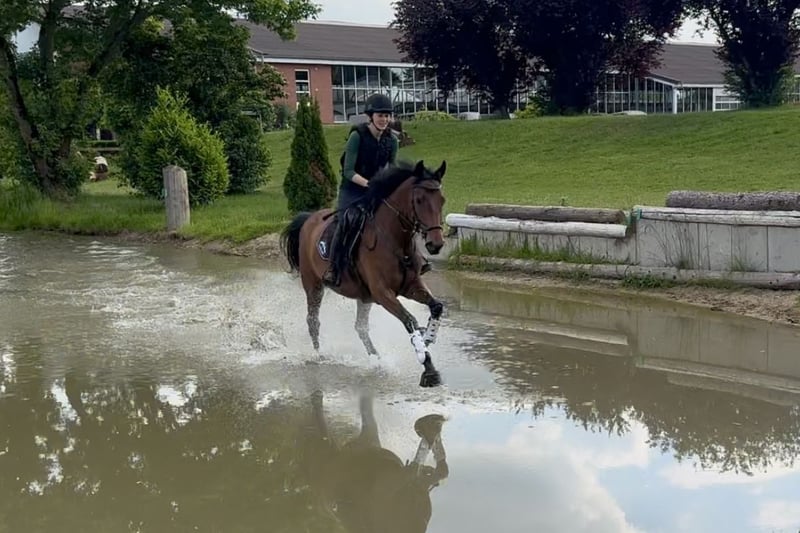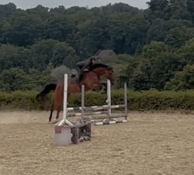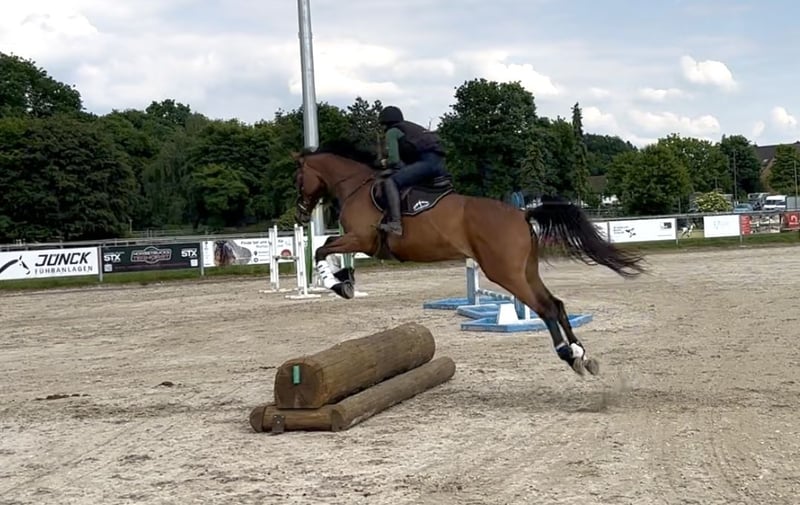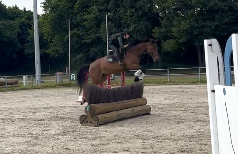 Donatella ist eine 2020 geborene, aktuell ca. 165 cm große, braune Trakehnerstute von Burma Gold xx x Cavallieri xx x Hohenstein. Die Abstammung und sämtliche Geschwister aus dieser Linie lassen auf eine vielseitige Eignung schließen. Donatella wird aktuell schonend und vielseitig ausgebildet. Besonders hervorzuheben ist hierbei ihre Leistungsbereitschaft und Springveranlagung. Sie springt bereits einen kompletten A-Parcous, überzeugt mit Mut, Vorsicht und Übersicht und bringt Potential für höhere Aufgaben mit. Ebenfalls hat sie bereits erste Erfahrungen beim Geländetraining gesammelt und empfiehlt sich bei weiterer Förderung für die Vielseitigkeit. Auch bei der Dressurarbeit bereitet Donatella ihrem Reiter viel Freude. Sie ist immer motiviert, möchte alles richtig machen und lernt schnell. So sind ihr alle Lektionen der Dressurpferde-L nicht fremd. Sie hat noch nie unter dem Reiter gebockt und vermittelt ihm stets ein sicheres Reitgefühl. Donatella liebt Aufmerksamkeit und besticht durch ihre freundlich-neugierige und unerschrockene Art. Zur Entspannung geht Sie regelmäßig alleine oder in der Gruppe in allen Gangarten ausreiten. Die Trakehnerstute ist es gewohnt, den Tag in einer Gruppe auf dem Paddock oder der Weide zu verbringen. Sie kommt direkt vom Züchter, ist geimpft, entwurmt und wird regelmäßig dem Hufschmied vorgestellt. Weitere Infos auf Anfrage, Standort 42579.