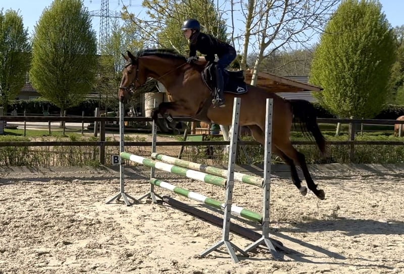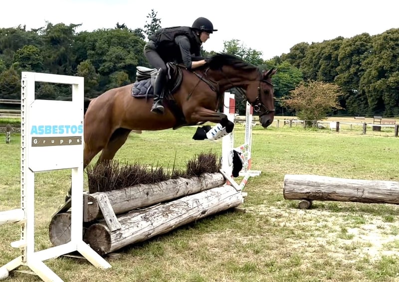 Donatella is a 2020-born, currently approximately 165 cm tall, brown Trakehner mare by Burma Gold xx x Cavallieri xx x Hohenstein. The pedigree and all siblings from this line suggest a versatile suitability. Donatella is currently being gently and diversely trained. Particularly noteworthy is her willingness to perform and her jumping ability. She is already jumping a complete A-course, impressing with courage, caution, and overview, and shows potential for higher tasks. She has also gained initial experience in cross-country training and, with further development, is well-suited for eventing. In dressage work, Donatella brings great joy to her rider. She is always motivated, wants to do everything right, and learns quickly. All the movements of the dressage horse L level are familiar to her. She has never bucked under the rider and always provides a secure riding feeling. Donatella loves attention and captivates with her friendly, curious, and fearless nature. For relaxation, she regularly goes out for rides alone or in a group at all gaits. The Trakehner mare is used to spending the day in a group in the paddock or pasture. She comes directly from the breeder, is vaccinated, dewormed, and regularly sees the farrier. Further information available upon request, location 42579.