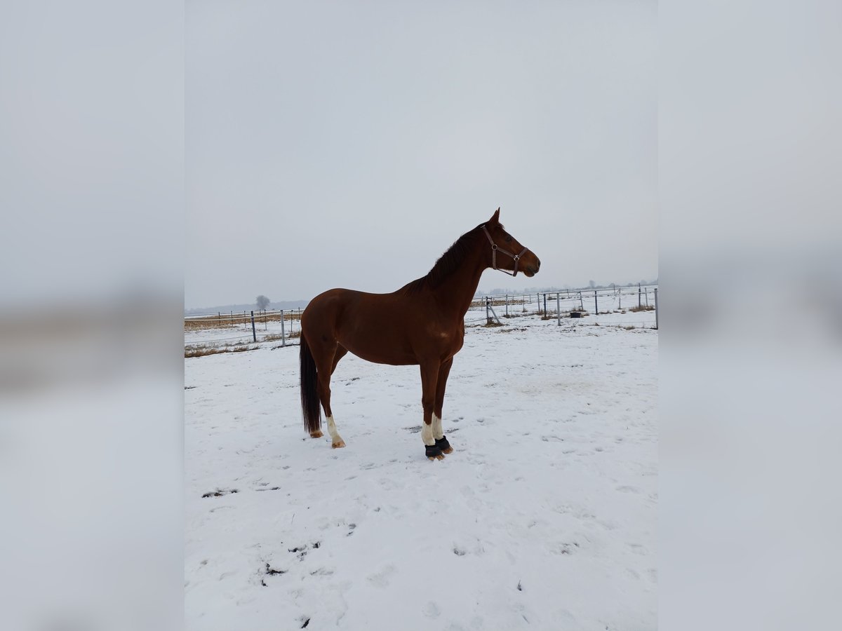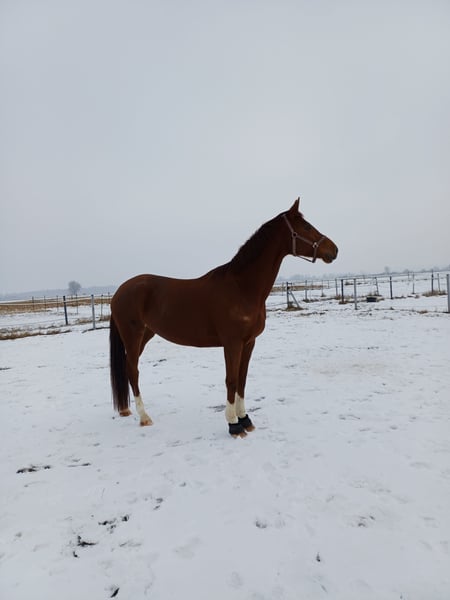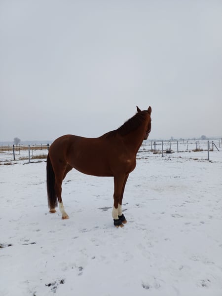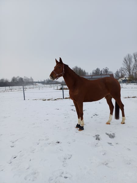 Püppi ist eine auffallend schicke 6-jährige Fuchsstute mit guten Grundgangarten. Sie ist äußerst verschmust, allerdings aufgrund ihres Alters und Ausbildungsstandes nicht anfängergeeignet. Auch sollte ein sicherer Umgang mit jungen Pferden sowie ein zügelunabhänger Reitersitz bei einem Jungpferd selbstverständlich sein! Sie wurde Anfang letzen Jahres angeritten und war 4 Monate unterm Sattel (DressurpferdeA fertig), bevor sie aus persönlichen Gründen wieder auf die Weide kam. Seit Anfang des Jahres befindet sie sich wieder im Aufbautraining. Sie geht auf eine alte Trakehner-Springlinie zurück, deshalb auch für die Zucht interessant. Wir selbst sind sie bisher noch nicht gesprungen. Sie hat noch keinen TÜV und der Preis steigt natürlich bei weiterer Ausbildung in den nächsten Monaten.